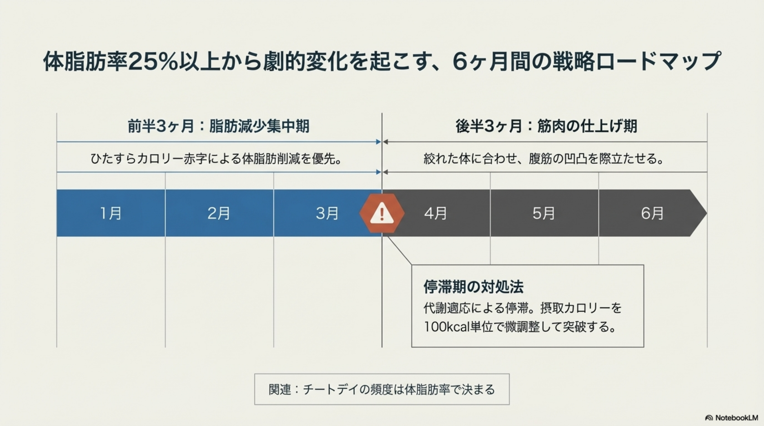 前半3ヶ月は体脂肪の減少に集中し、後半3ヶ月は腹筋トレーニングの強度を上げて筋肉の凹凸を仕上げていく戦略が効果的です。
