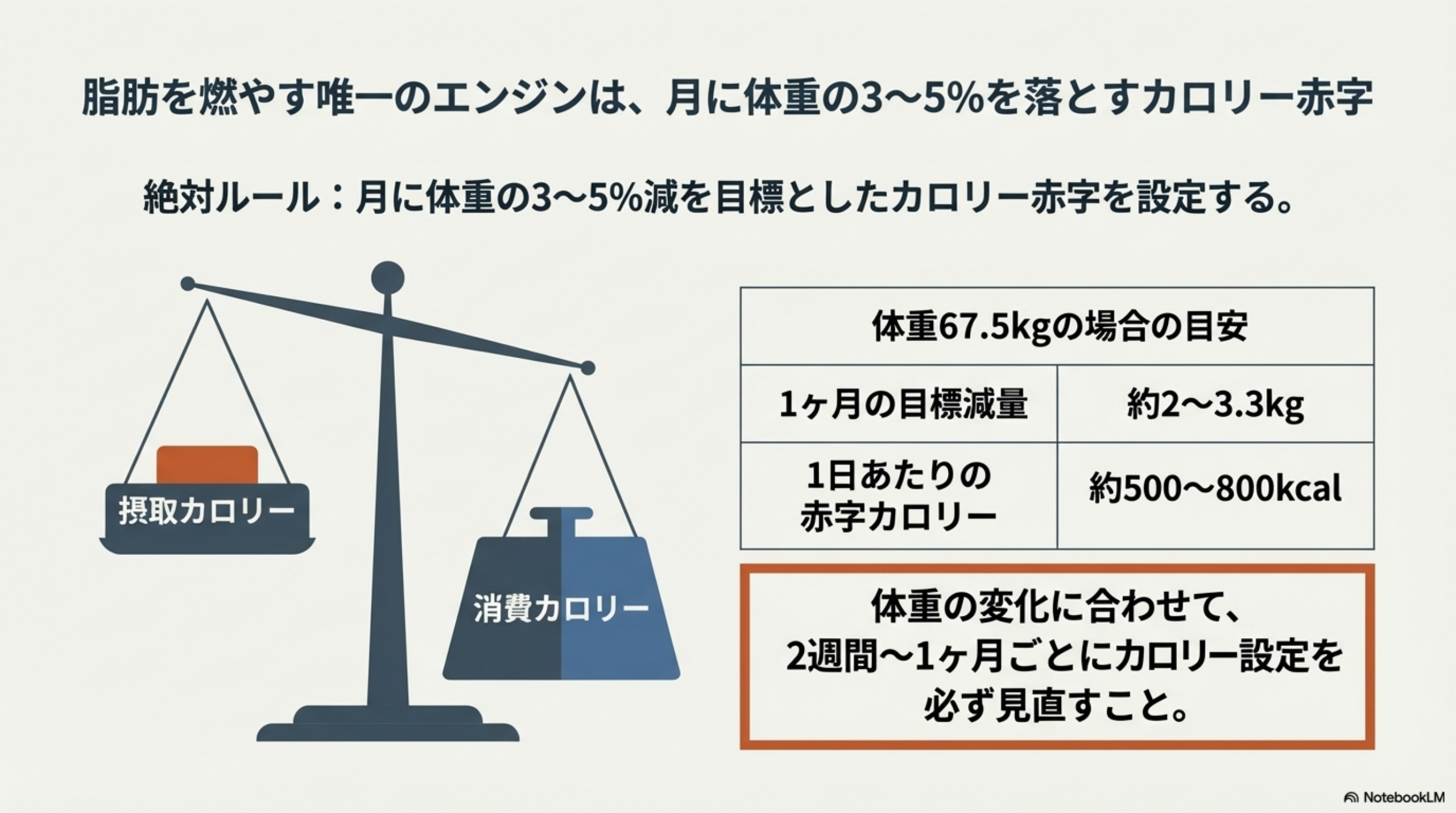 - 🔹 摂取カロリーを100kcal単位で微調整する(大幅にカットしない)