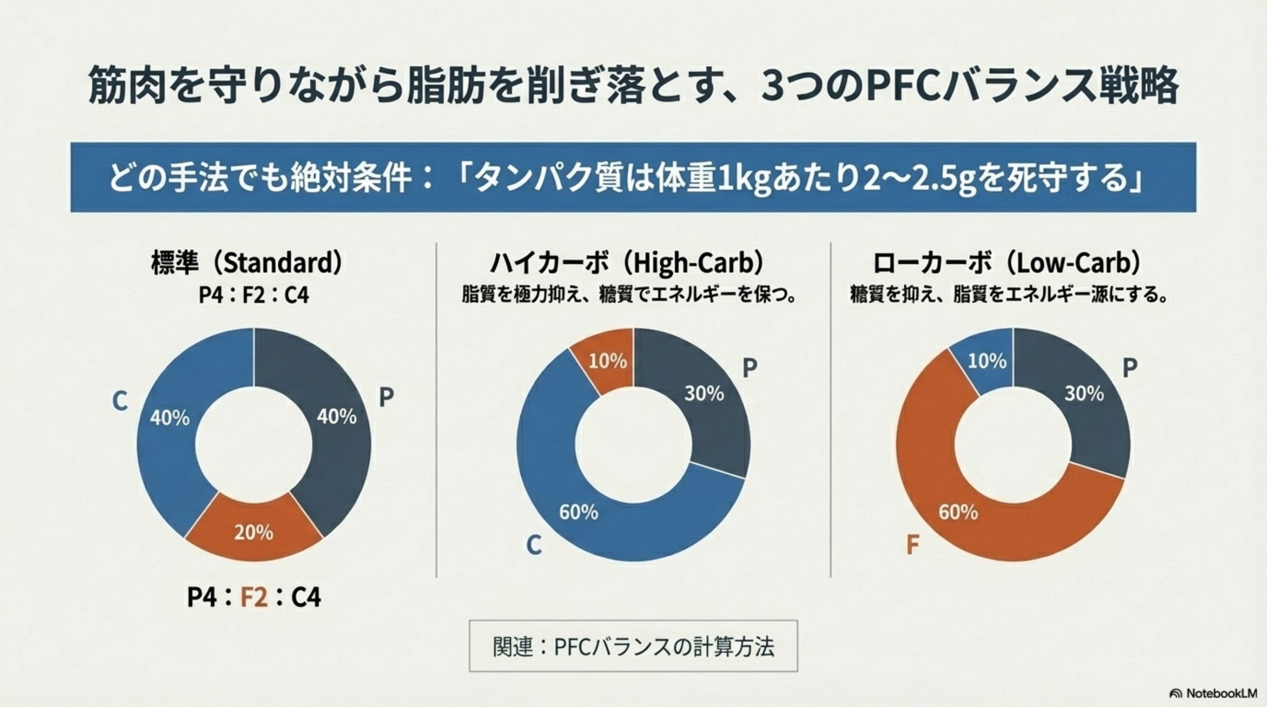 PFCの具体的な計算手順は、PFCバランスの計算方法|増量期・ダイエット・筋トレの最適な割合で詳しく解説しています。