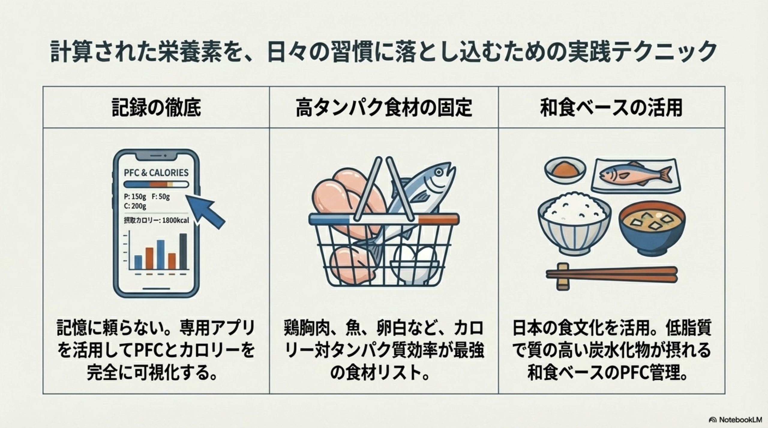 食事管理で最も重要なのは記録することです。記録しないと、カロリーもPFCも「なんとなく」になり、結果が出にくくなります。