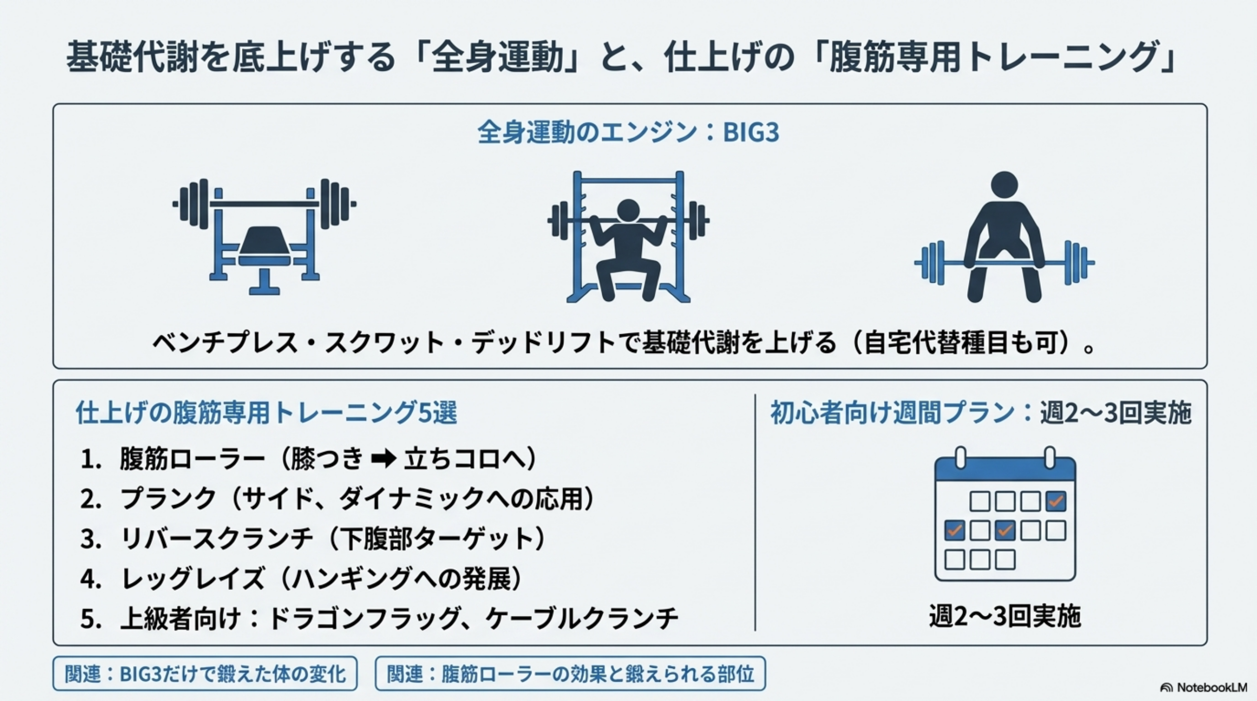 全身の大筋群を使う複合運動(スクワット・デッドリフト・ベンチプレスなど)は、基礎代謝を維持しながら体脂肪を効率的に落とすために効果的です。腹筋専用のトレーニングは、シックスパックの凹凸を際立たせる「仕上げ」として位置づけてください。