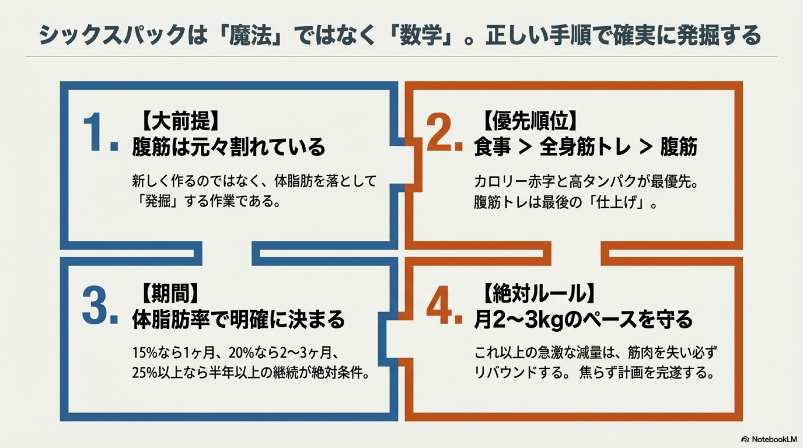 月に体重の3〜5%を超えない減量ペースを守り、筋肉を維持しながら体脂肪だけを落とすことが、遠回りに見えて最も確実なシックスパックへの道です。焦らず、自分の体脂肪率と相談しながら進めてください。