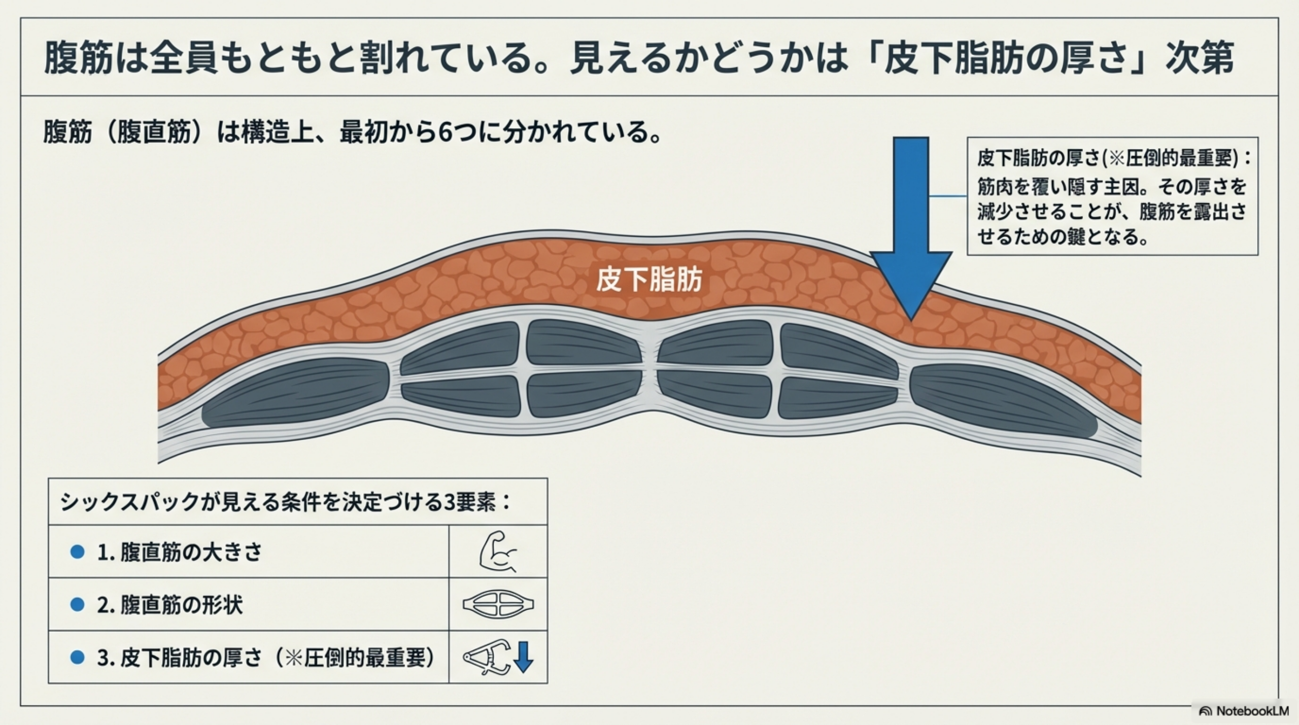 腹筋が見えるかどうかを決める3つの要素: