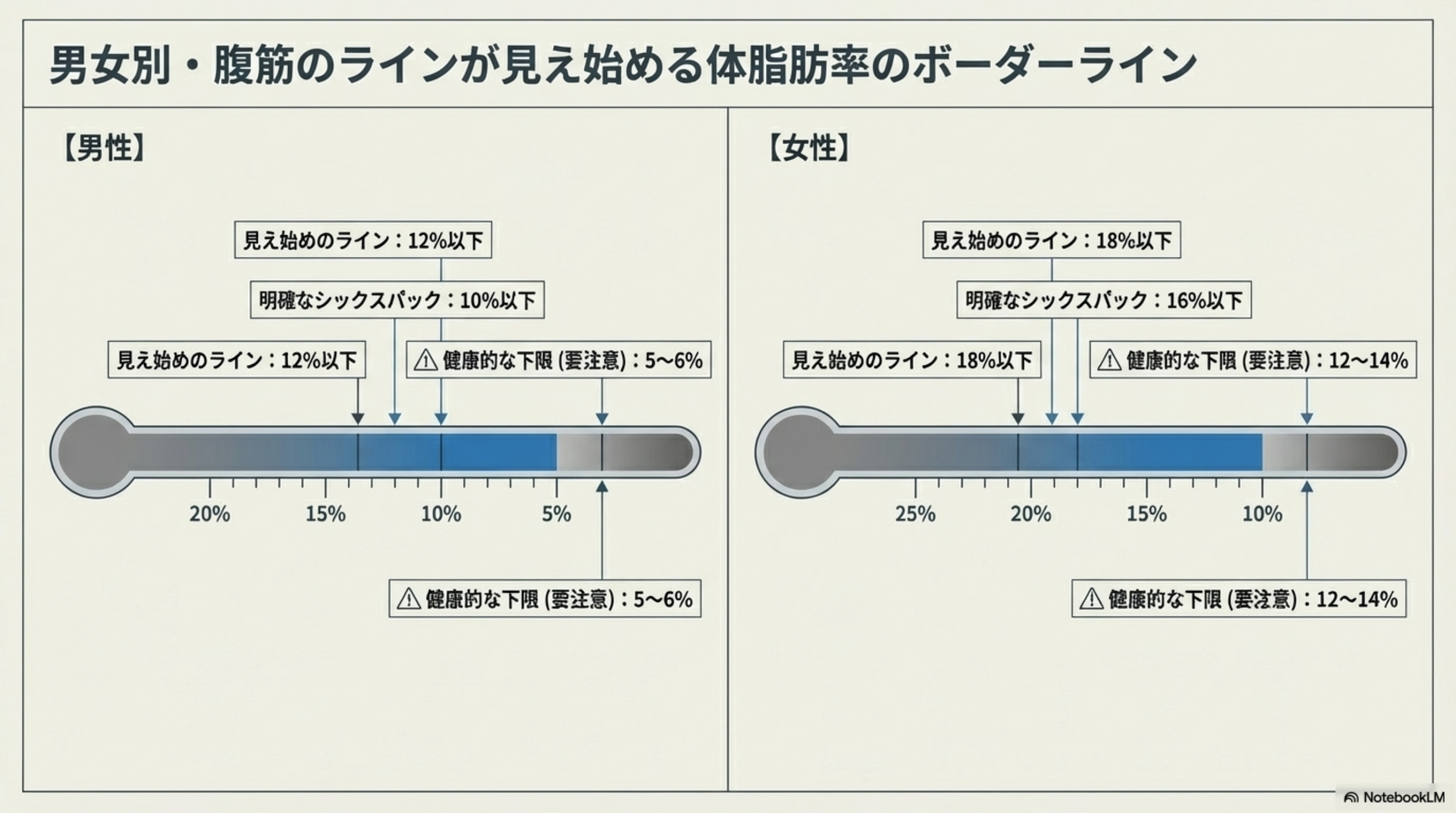 男性は10〜12%、女性は**16〜18%**で腹筋が見え始めます。くっきりしたシックスパックには、男性10%以下、女性16%以下が目安です。