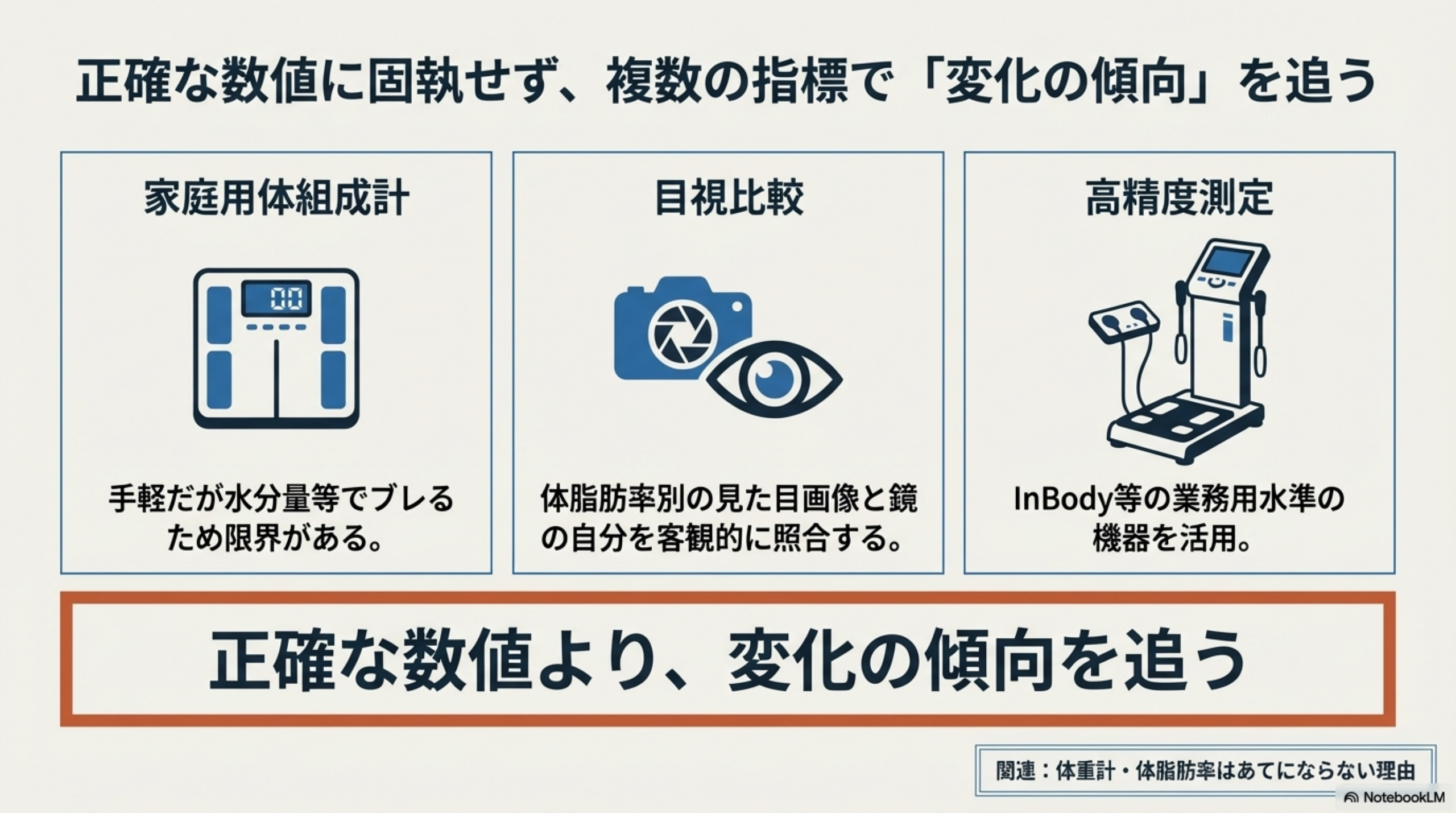 重要なのは**「正確な数値」よりも「変化の傾向」を追うこと**です。同じ体組成計・同じ条件(時間帯・服装・食事前後)で定期的に測定し、数値が下がっているかどうかを見ましょう。