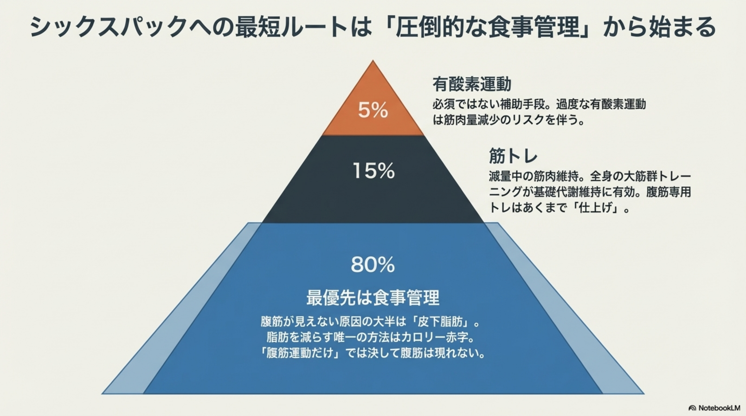 やるべきことの優先順位は食事管理が最重要で、カロリー赤字を作りながらタンパク質を体重1kgあたり2〜2.5g確保すること。次に全身の筋トレで筋肉を維持し、腹筋トレーニングで凹凸を仕上げます。
