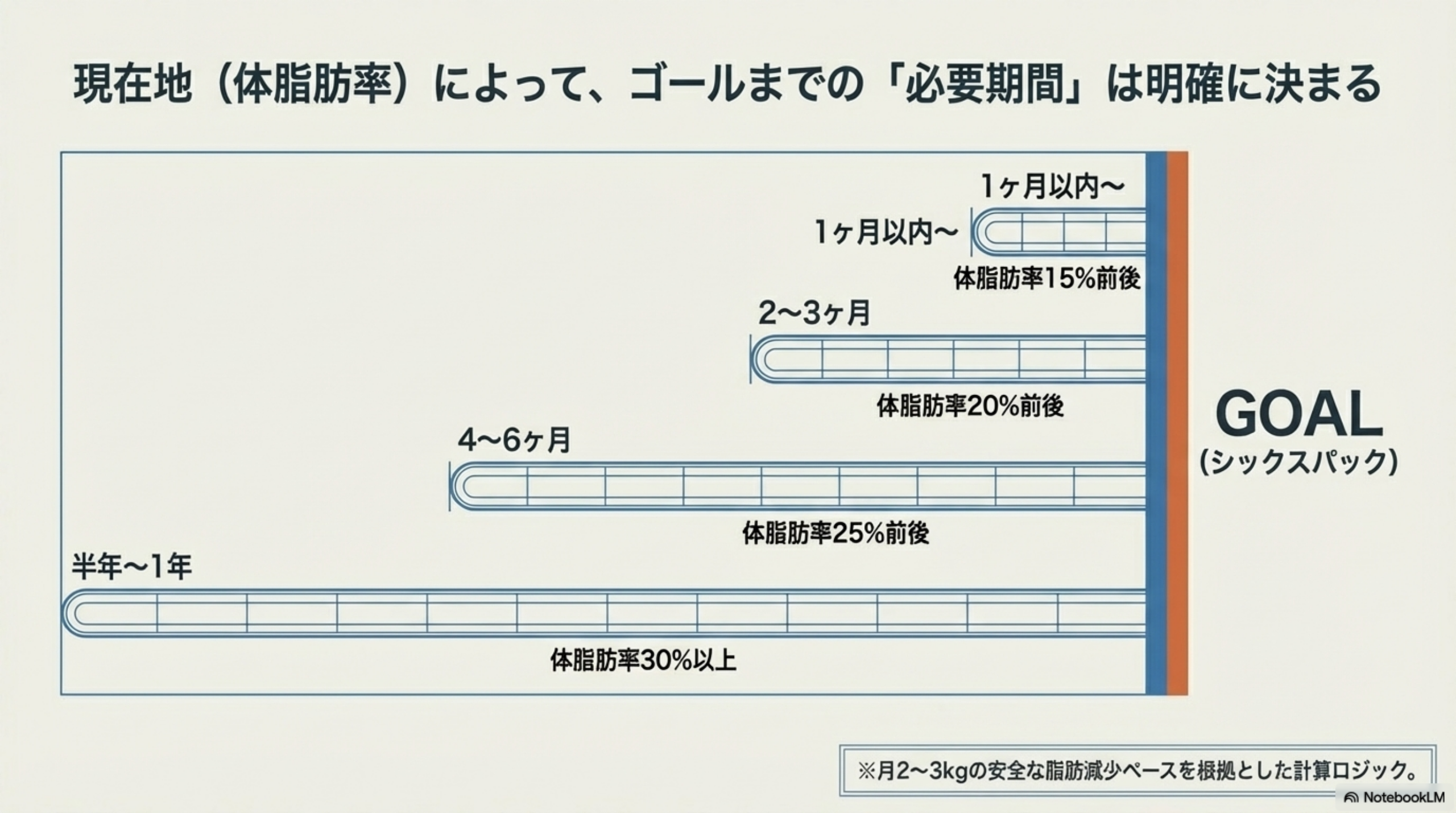 腹筋を割るまでの期間は、現在の体脂肪率と健康的な減量ペースから逆算できます。