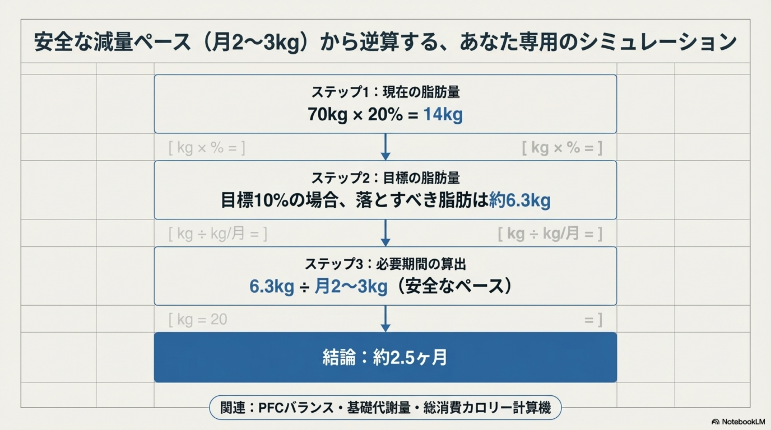 | 減らすべき脂肪量 | 14kg − 6.3kg ≒ 約7.7kg |