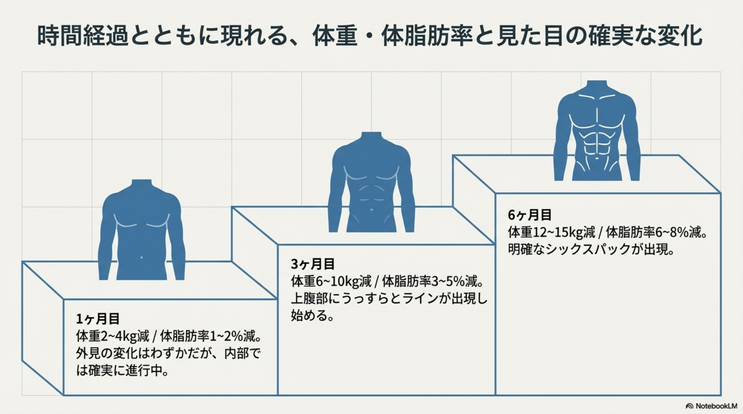 📅 1ヶ月目: 体重は約2〜4kg減少、体脂肪率は1〜2%程度下がります。外見の変化はわずかな引き締まりを感じる程度で、腹筋の輪郭はまだ見えません。この段階は「まだ変わらない」と感じやすい時期ですが、体の中では着実に変化が始まっています。