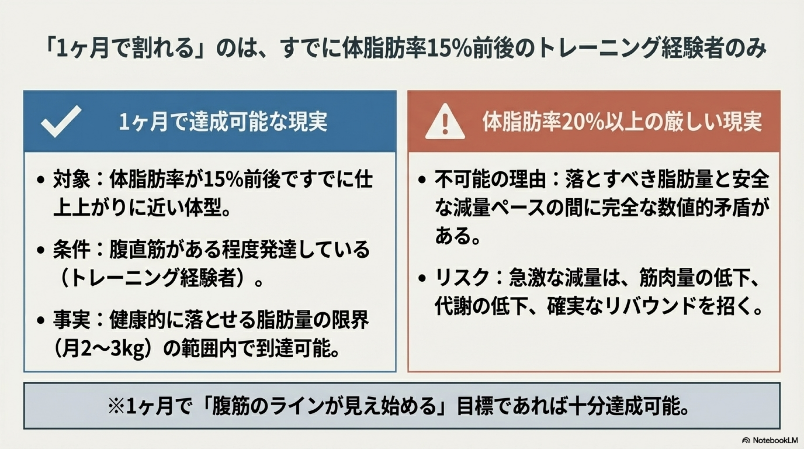 体脂肪率20%の人がシックスパック(10%以下)に到達するには約7〜8kgの脂肪を落とす必要があり、これを1ヶ月で行うと月の減量幅が体重の10%を超えます。この速度での減量は脂肪だけでなく筋肉も大幅に失われ、代謝低下・免疫力低下・ホルモンバランスの乱れを招きます。