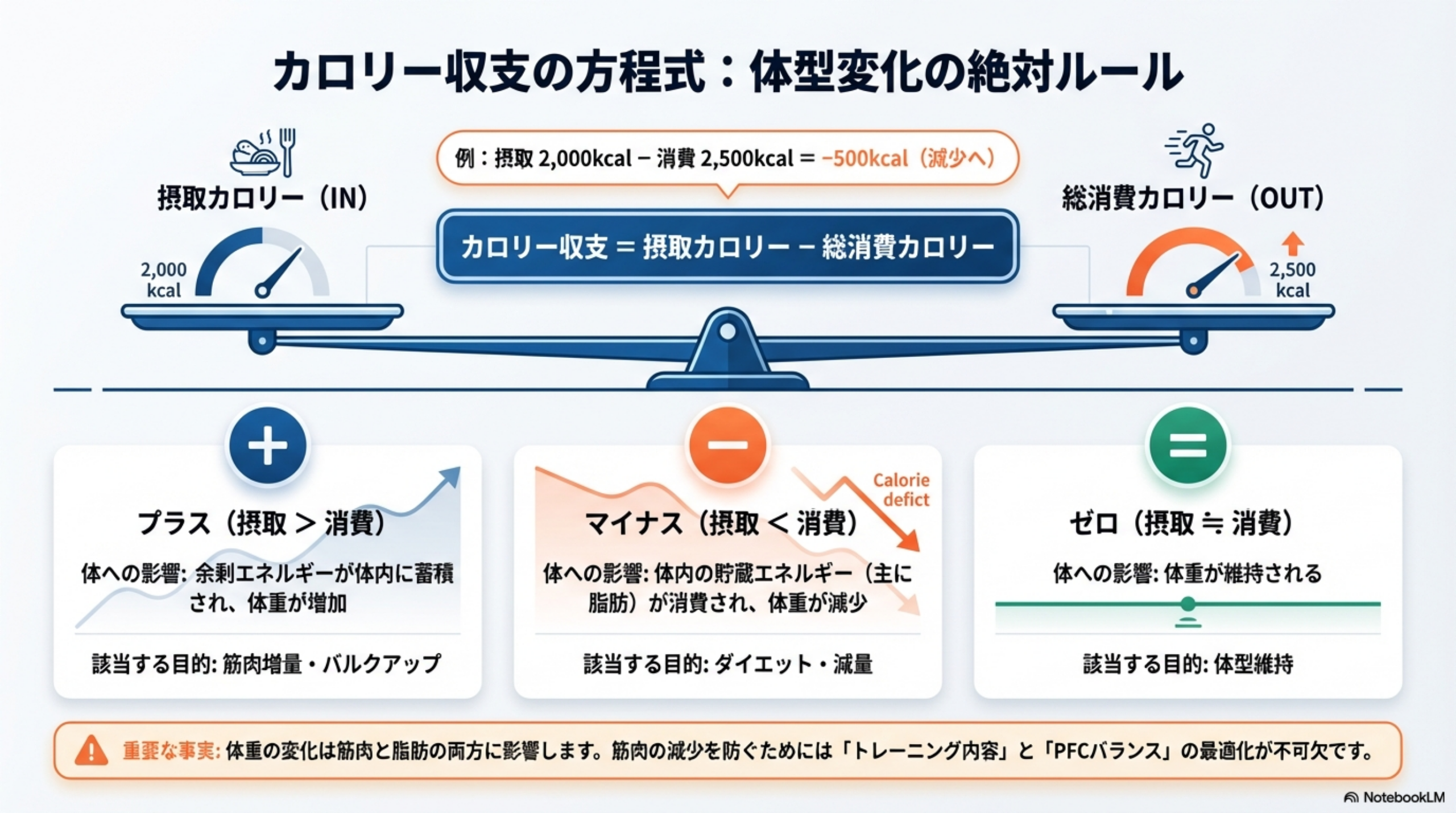 | マイナス(摂取 < 消費) | 体内の貯蔵エネルギー(主に脂肪)が消費され、体重が減少 | ダイエット・減量 |