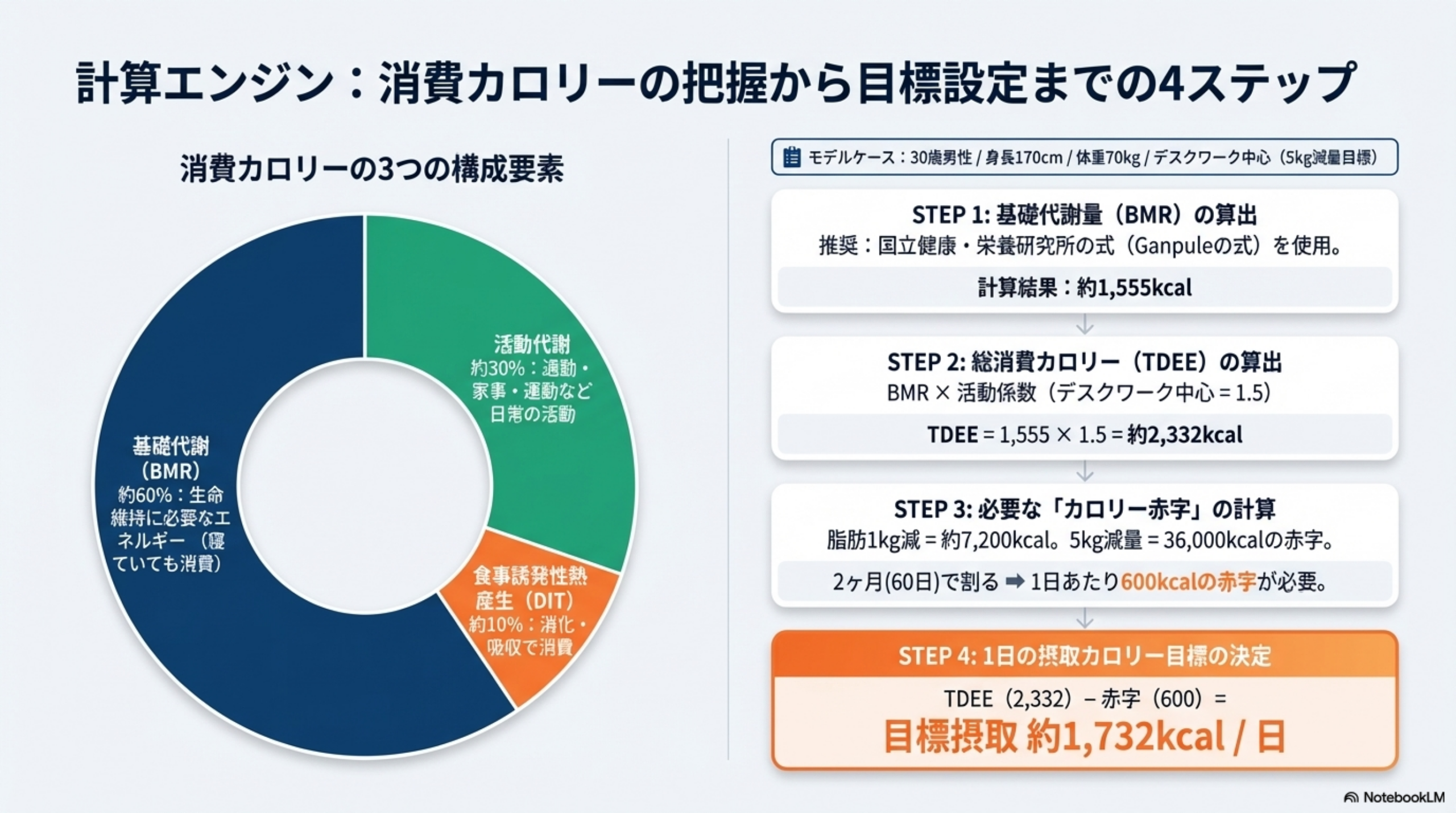 📋 モデルケース: 30歳男性 / 身長170cm / 体重70kg / デスクワーク中心で活動レベルは低い