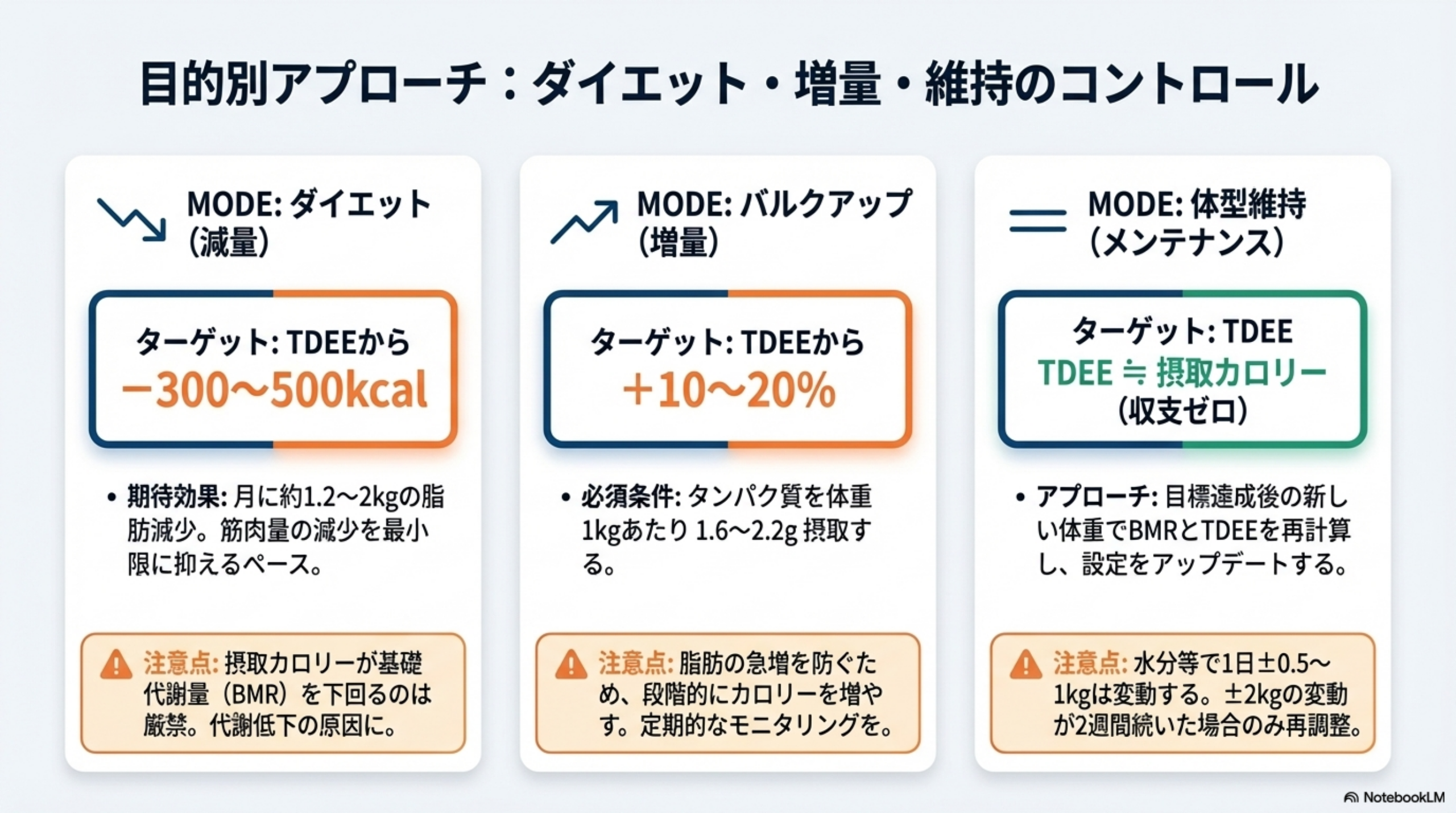 筋肉量を増やすには、カロリー収支を適度なプラスに保つ必要があります。目安はTDEEに対して**+10〜20%**(200〜500kcal程度)です。