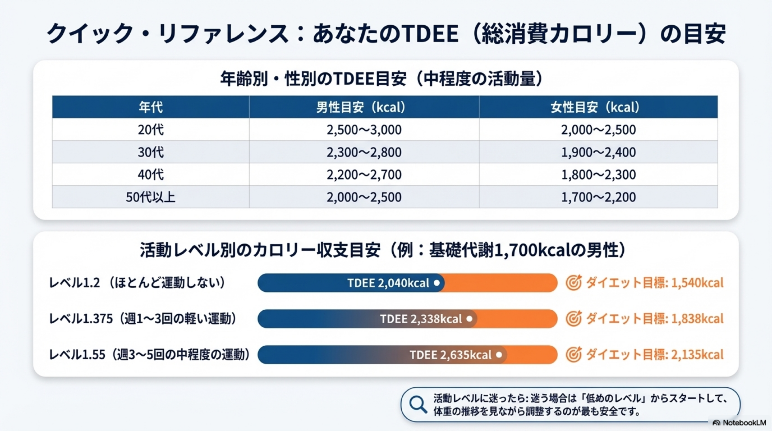 🔍 活動レベルの判断に迷ったら: 自分の日常生活と運動習慣を客観的に見て、最も近いレベルを選んでください。迷う場合は低めを選んで、体重の推移を見ながら調整するのが安全です。「週3回ジムに行っている」としても、それ以外の時間がほぼ座り仕事であれば、1.375〜1.55の間が現実的です。