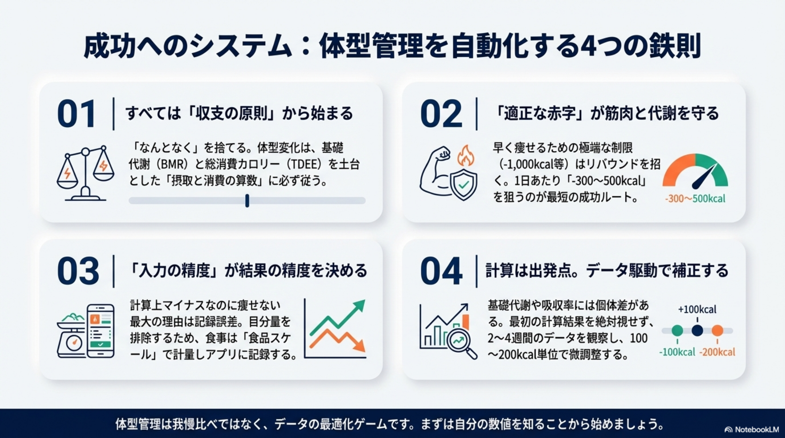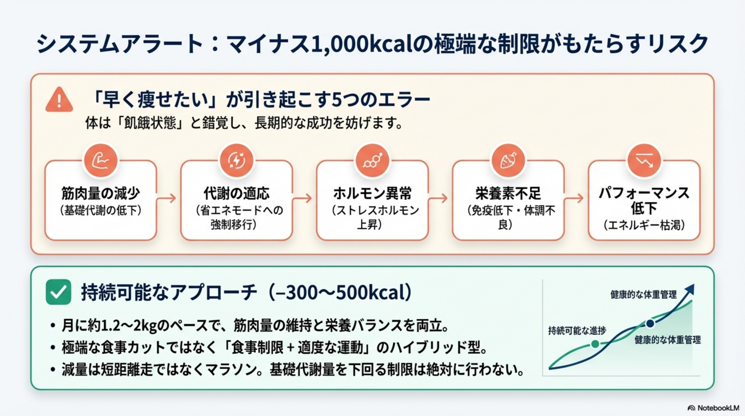 ⚠️ 注意点: 摂取カロリーが基礎代謝量を大きく下回ると、代謝機能の低下・筋肉量の減少・ホルモンバランスの乱れを招きます。短期間の急激な減量は、長期的に見てリバウンドのリスクを高めます。