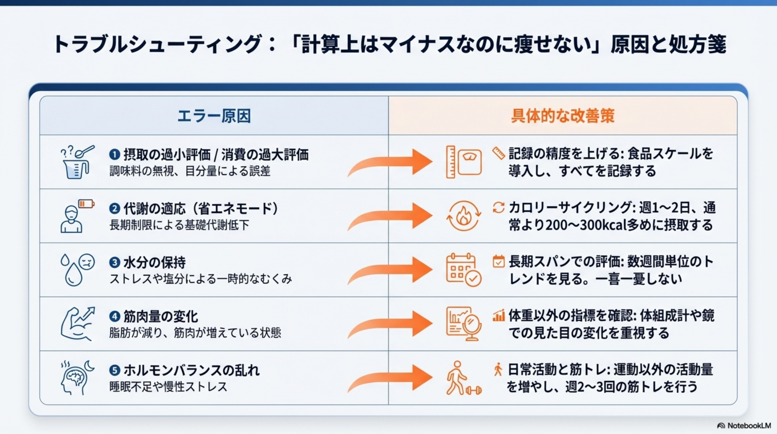 カロリー収支をマイナスに設定しているはずなのに体重が減らない——これは多くの人が経験する悩みです。前述の通り、カロリー計算は推定値であり、いくつかの要因がこの現象を引き起こします。