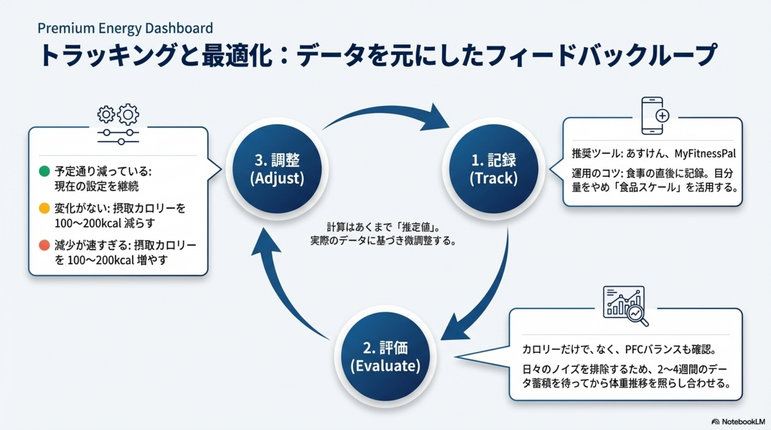 体重だけでなく、体調やエネルギーレベルも考慮に入れてください。数値上は減量が進んでいても、極度の疲労感や集中力の低下がある場合は、カロリー制限を緩める必要があります。