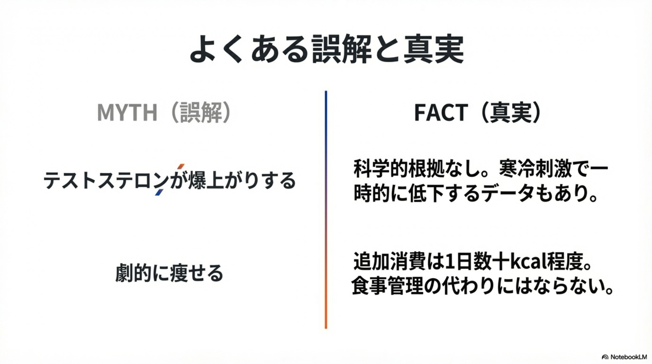 ネットで調べても「テストステロンが上がる」「免疫力がつく」といった情報と、「ヒートショックで危険」という警告が入り混じり、何が正しいのか判断できないのが実情です。実際、広く信じられている効果の中には科学的に否定されているものもあります。