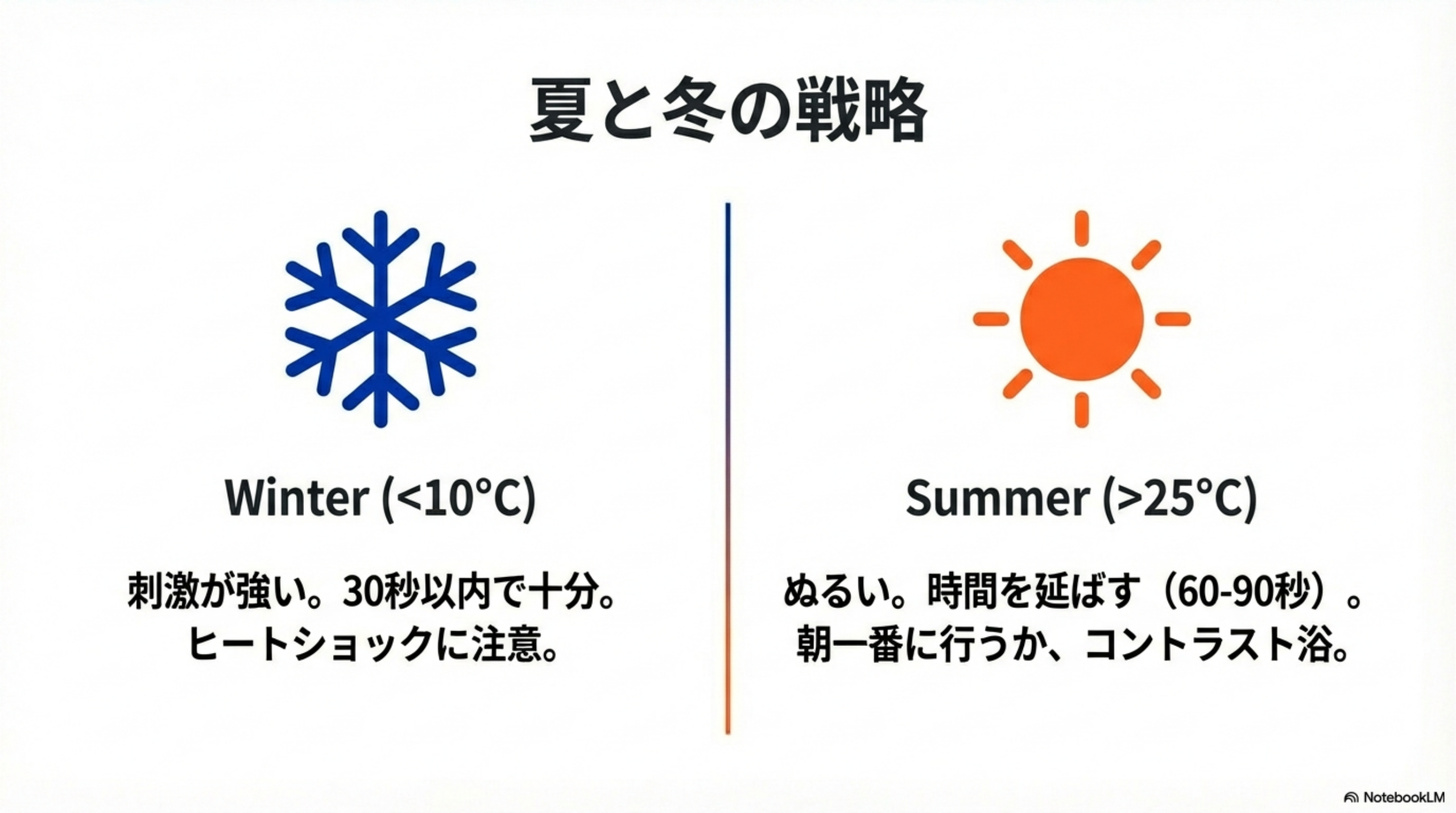 夏場の具体的な対処法は後半の「夏のコールドシャワー」セクションで詳しく解説します。