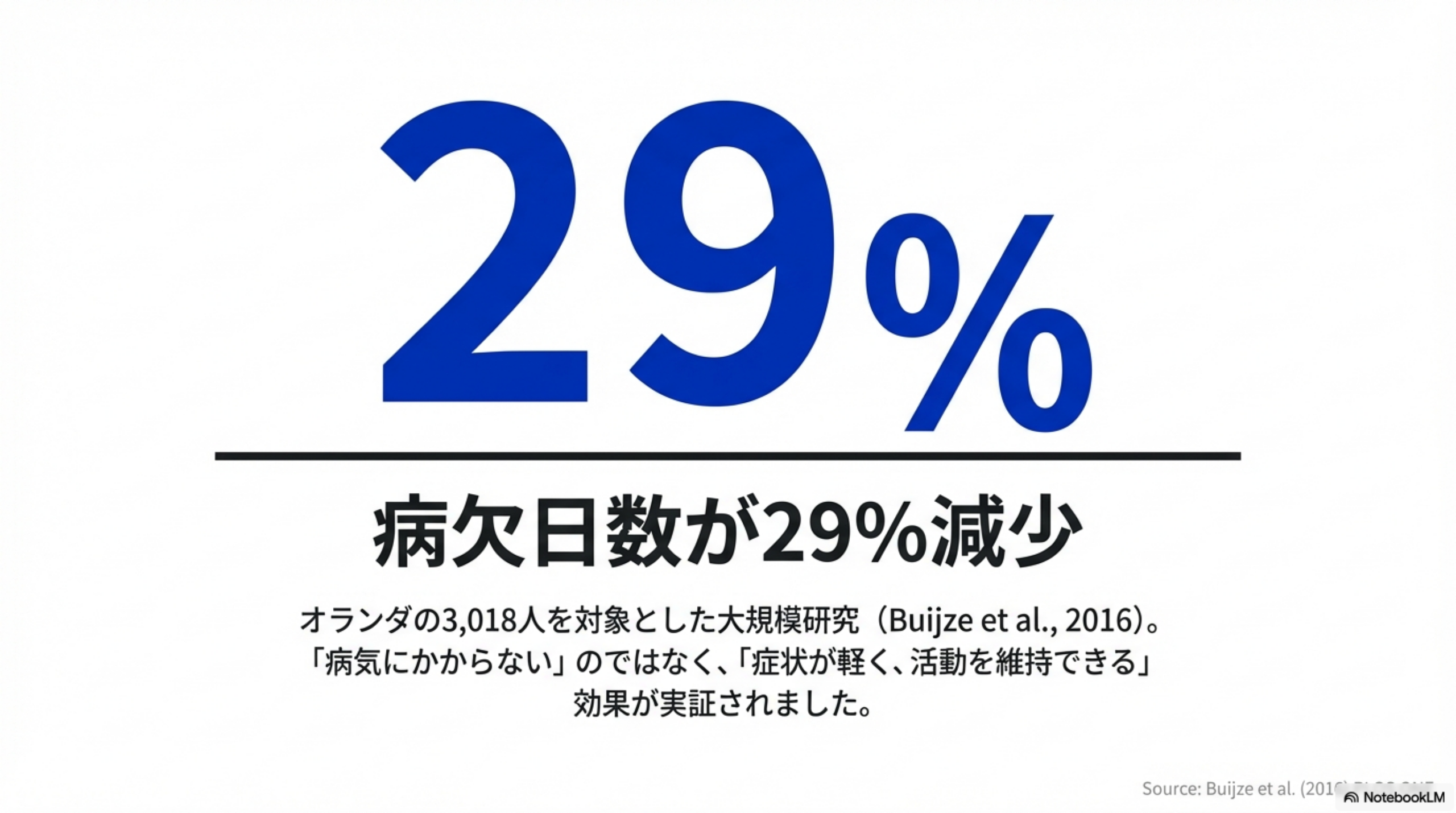 • 🔬 定期的な運動を併用したグループでは病欠が54%減少