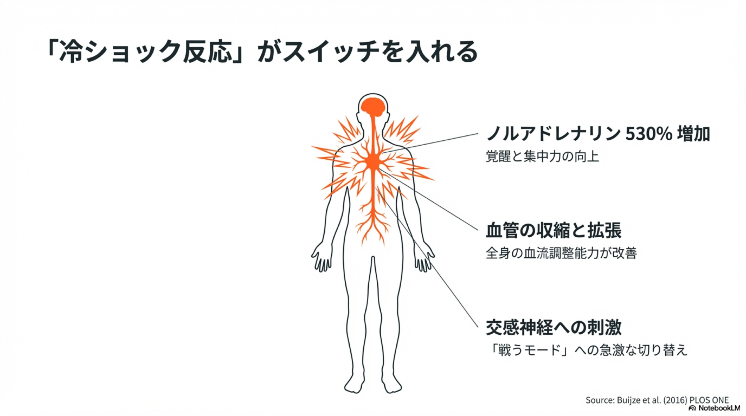 Šrámek et al.の研究では、14°Cの冷水浸漬によりノルアドレナリンが530%増加したことが報告されています。ノルアドレナリンは覚醒・注意力・気分の調整に関わる神経伝達物質であり、この大幅な増加が「冷水を浴びた後のスッキリ感」の生理的な正体と考えられます。