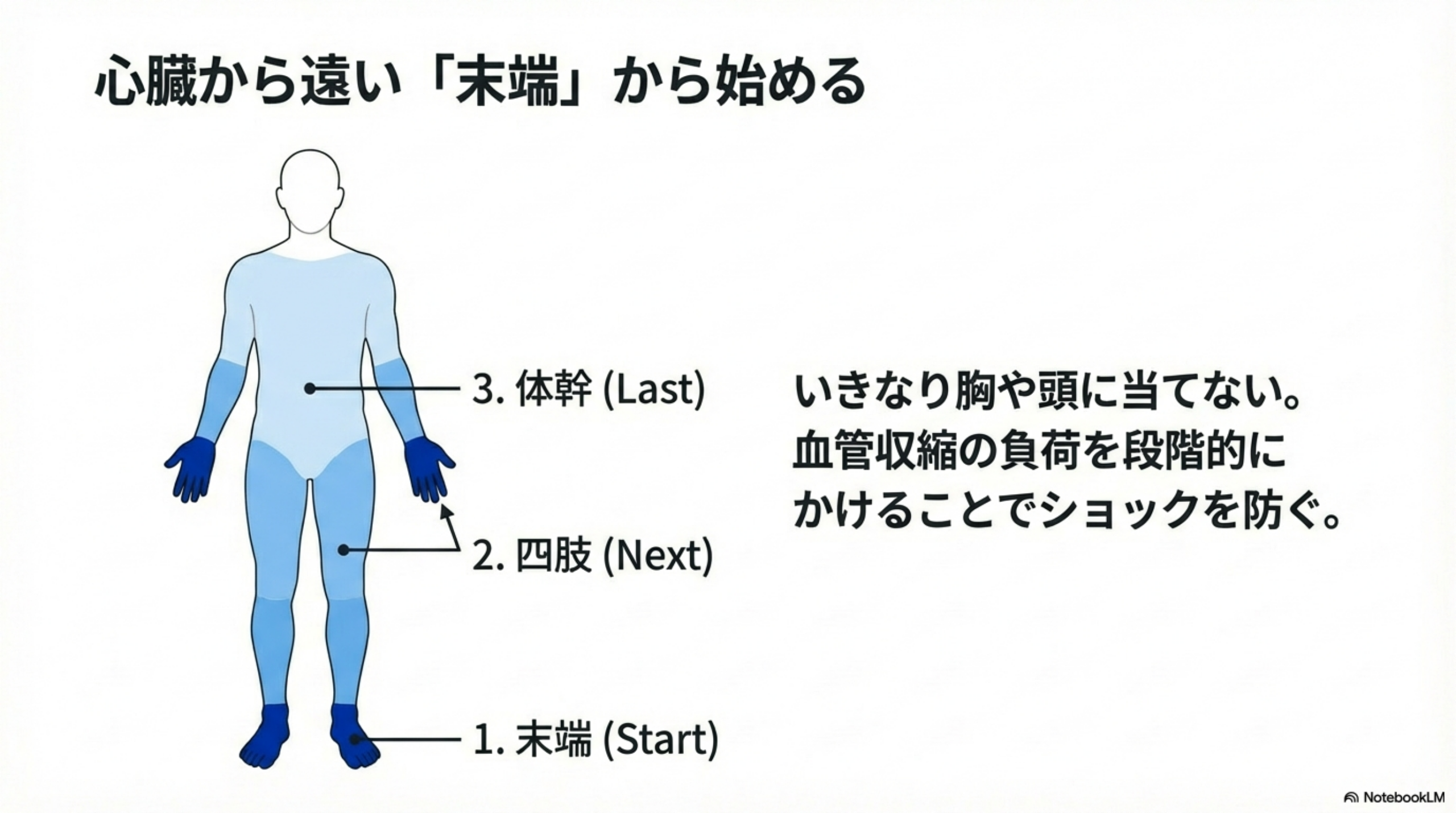 なお、この「効果を高める当て方」は後述する「基本手順5ステップ」の安全な順番(末端→体幹→頭)とは異なる観点です。まず安全な手順を守った上で、体幹に冷水を当てるフェーズで肩甲骨周辺を意識するとよいでしょう。