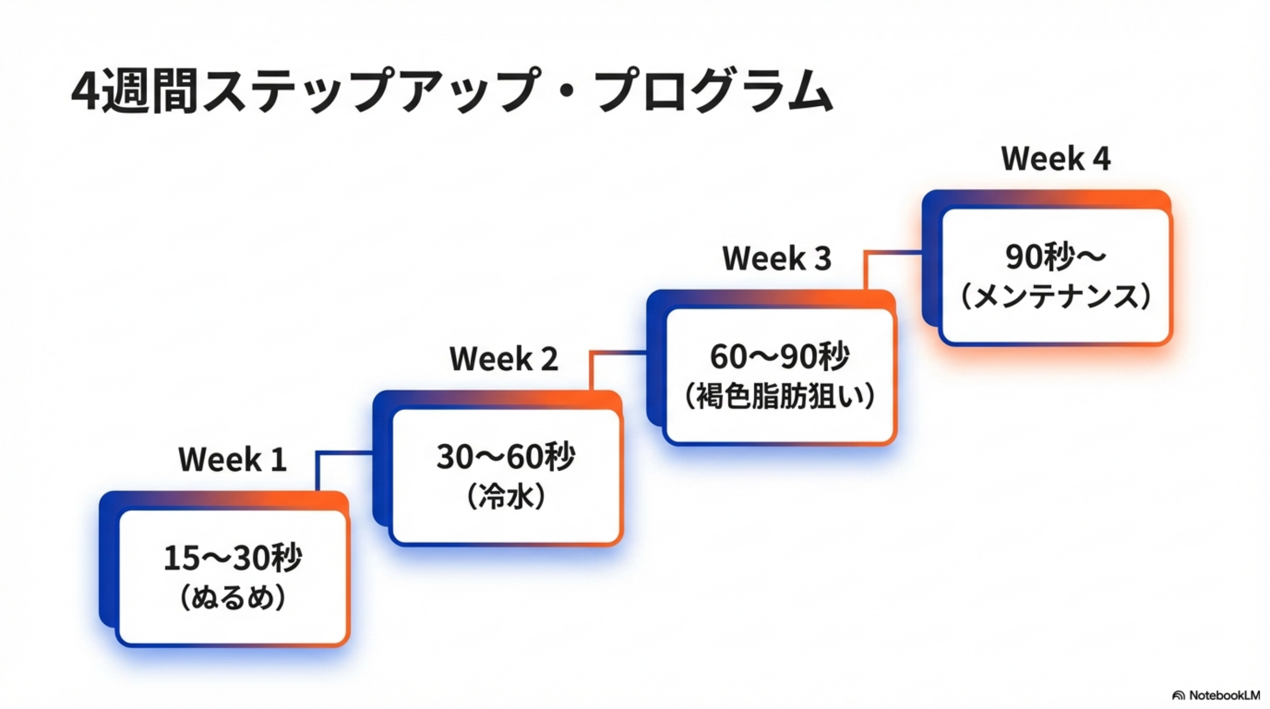 効果を得るための水温の目安は15°C以下で、日本の水道水は秋〜春なら蛇口全開でこの条件を満たします。手足の末端から体幹、頭は最後という安全な順序を守り、4週間のステップアッププログラムに沿って段階的に慣らしていくのが継続のコツです。