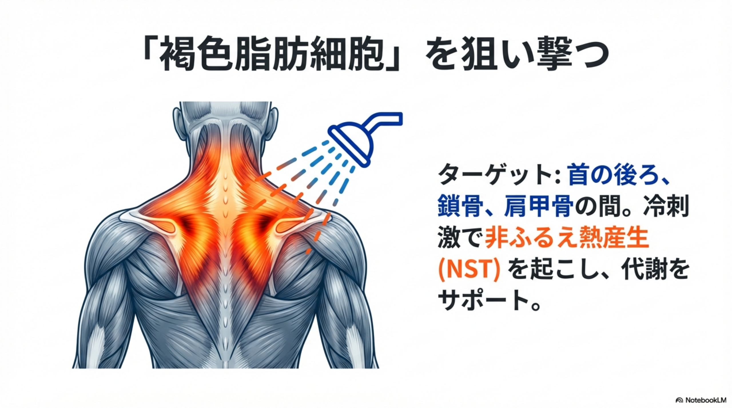 冷水刺激は体内の褐色脂肪組織(BAT: Brown Adipose Tissue)を活性化させます。褐色脂肪は通常の白色脂肪とは異なり、カロリーを蓄えるのではなく燃焼して熱を生み出す特殊な脂肪組織です。冷刺激を受けると褐色脂肪が**非ふるえ熱産生(NST)**を行い、体温維持のためにエネルギーを消費します。