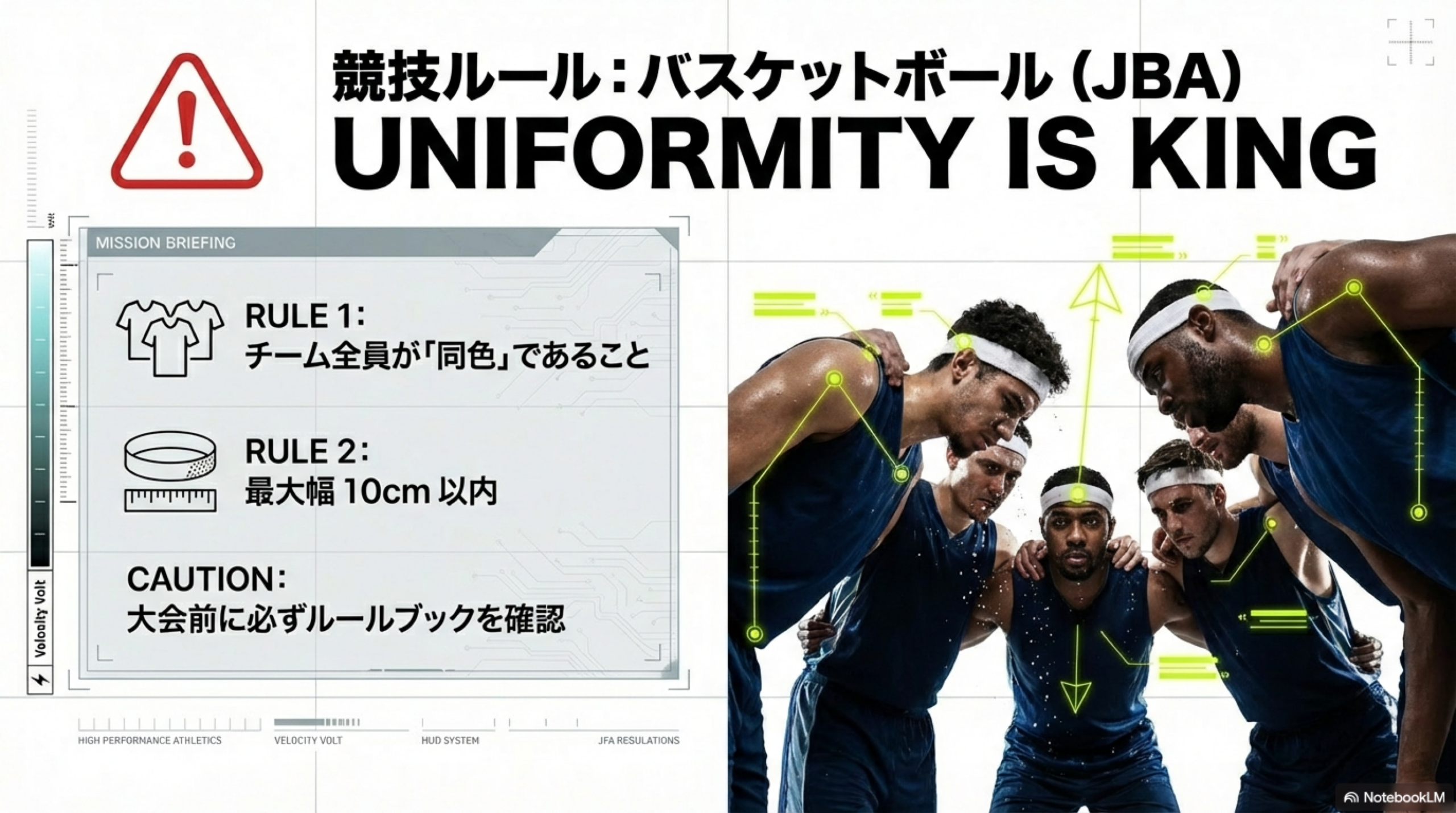 使えますが、チーム全員で同じ単色に統一する必要があります。最大幅10cm、繊維素材であることが条件です(JBA競技規則)。大会前にチームメイトと色を揃えておきましょう。