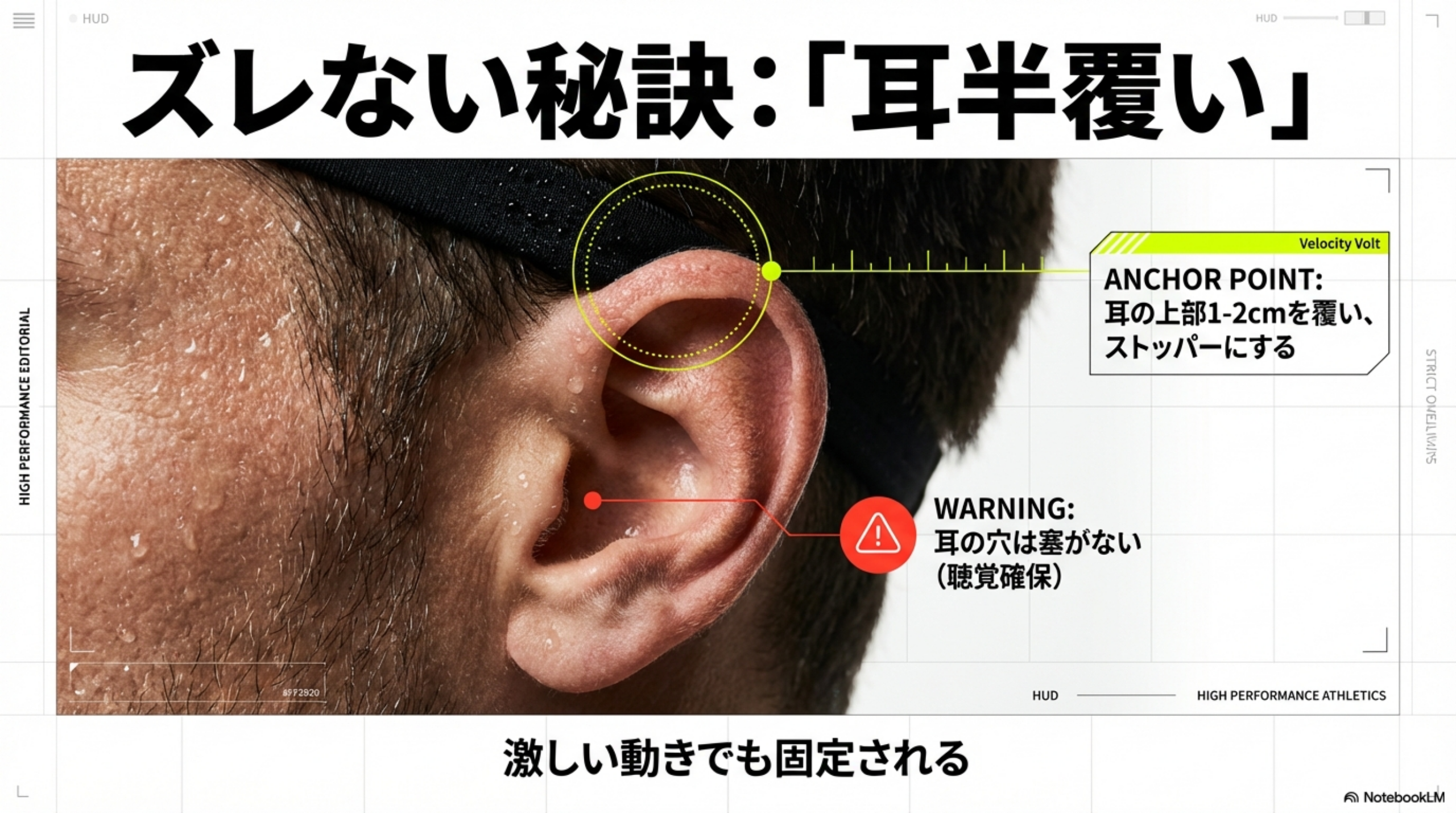 | 耳の上部を軽く覆う | ずれにくくなる | きつすぎないよう調整 |
