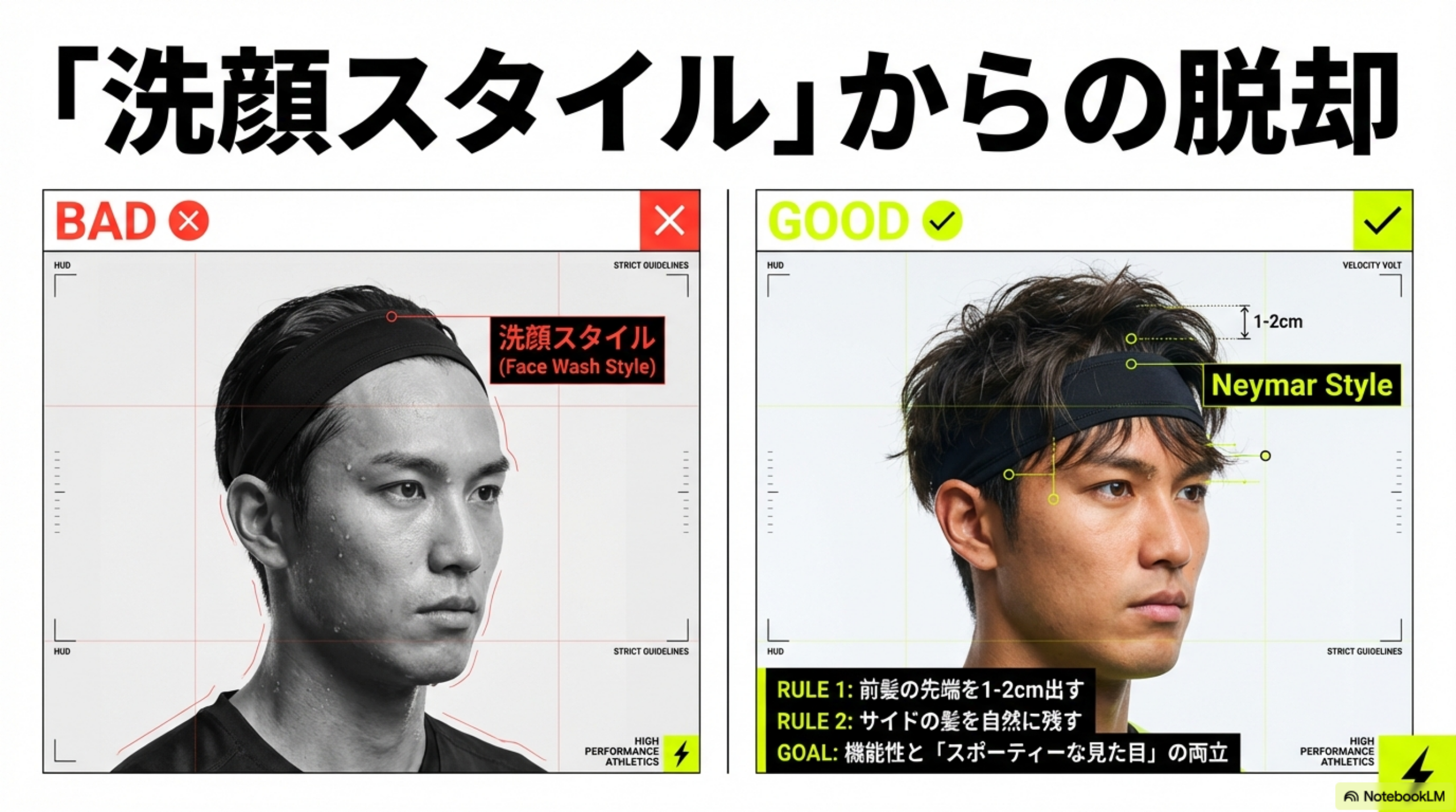 メンズがヘアバンドを避ける理由のひとつが「洗顔用に見える」「スポーツ感が出すぎる」という見た目の問題です。以下のポイントを押さえれば、スポーティーでかっこいい印象に仕上がります。