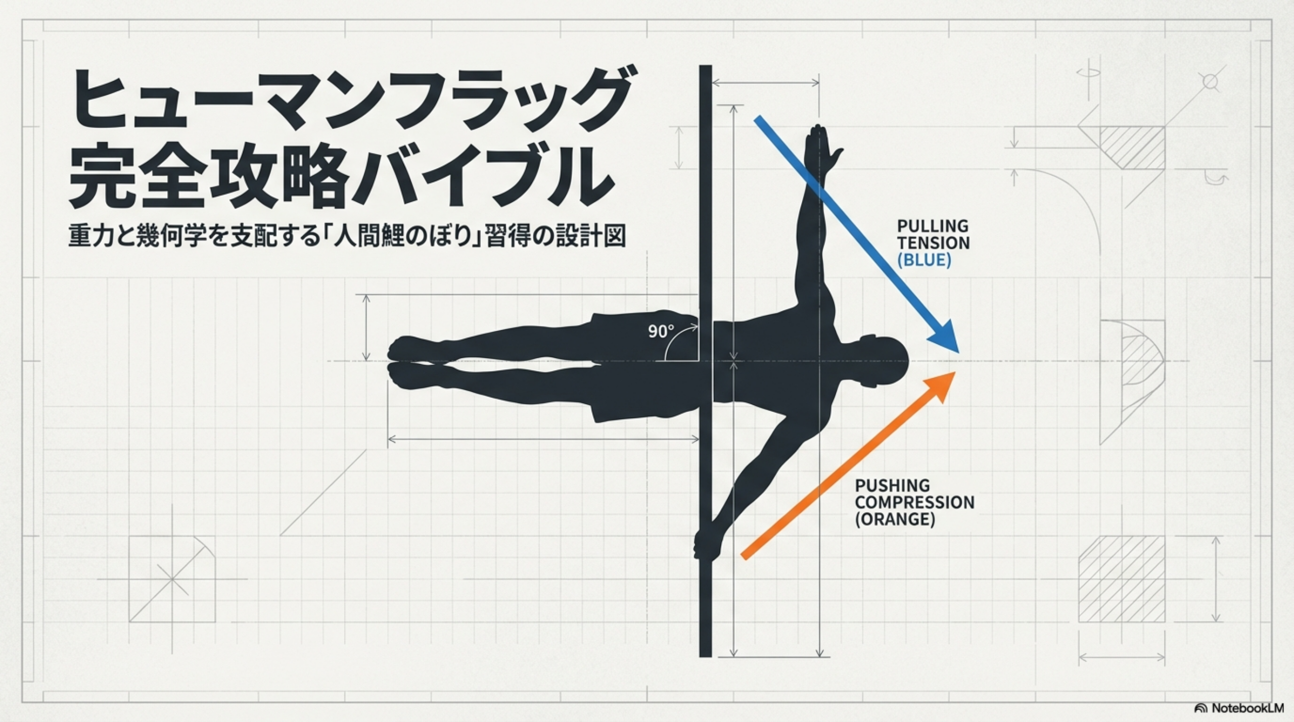 ヒューマンフラッグは、垂直な支柱やバーを両手で握り、体全体を水平に保持する自重トレーニングの技です。上の手で体を引き寄せ、下の手で押し出す相反する力のバランスによって、重力に逆らった姿勢を維持します。