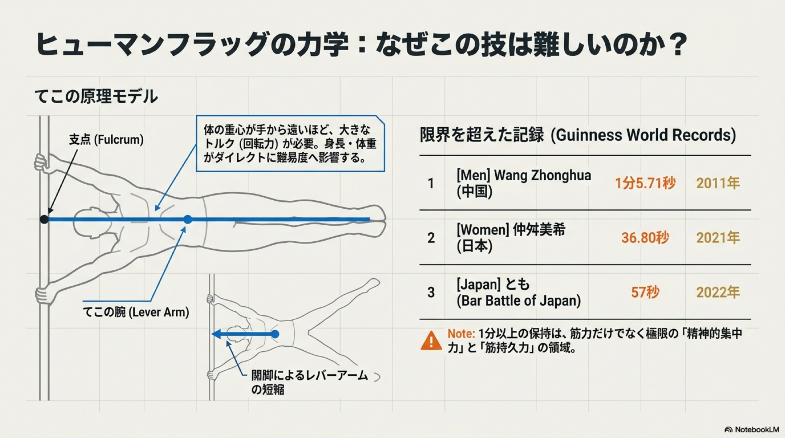 ヒューマンフラッグの保持時間の記録は、この技の難易度を如実に示しています。