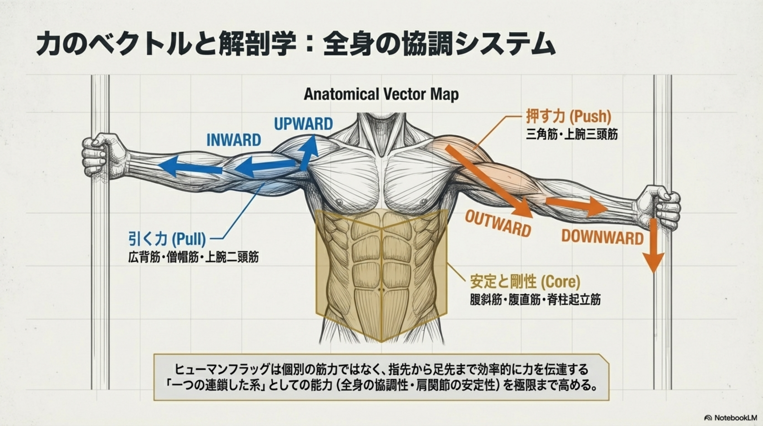 ヒューマンフラッグの成功は、個々の筋肉の強さだけでなく、それらが協調して働く能力にかかっています。体は一つの連鎖した系として機能し、力は指先から足先まで効率的に伝達される必要があります。
