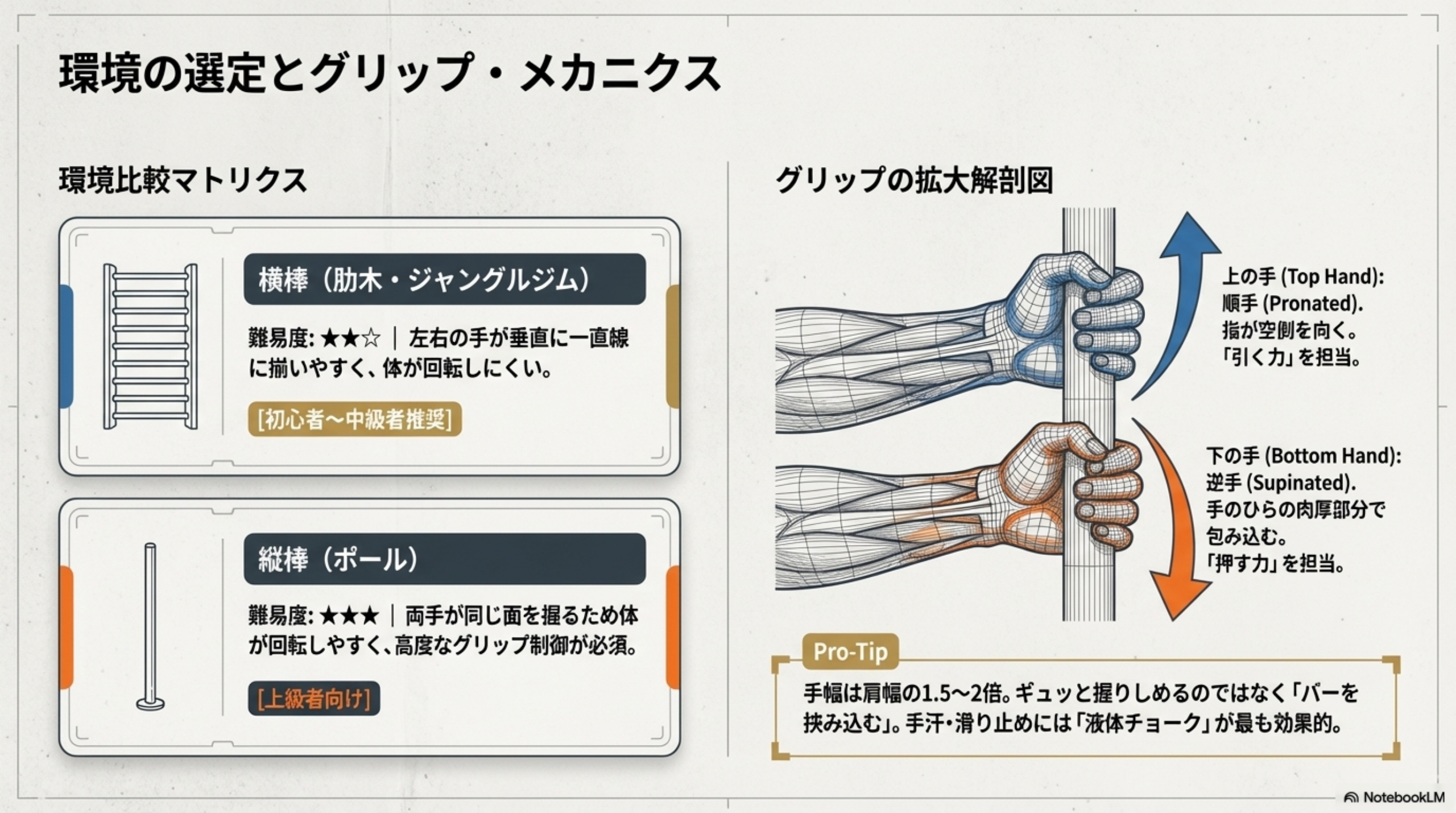 | 上の手 | 体を支柱に引き寄せる | 順手(プロネーテッド) | 広背筋・僧帽筋・上腕二頭筋 |