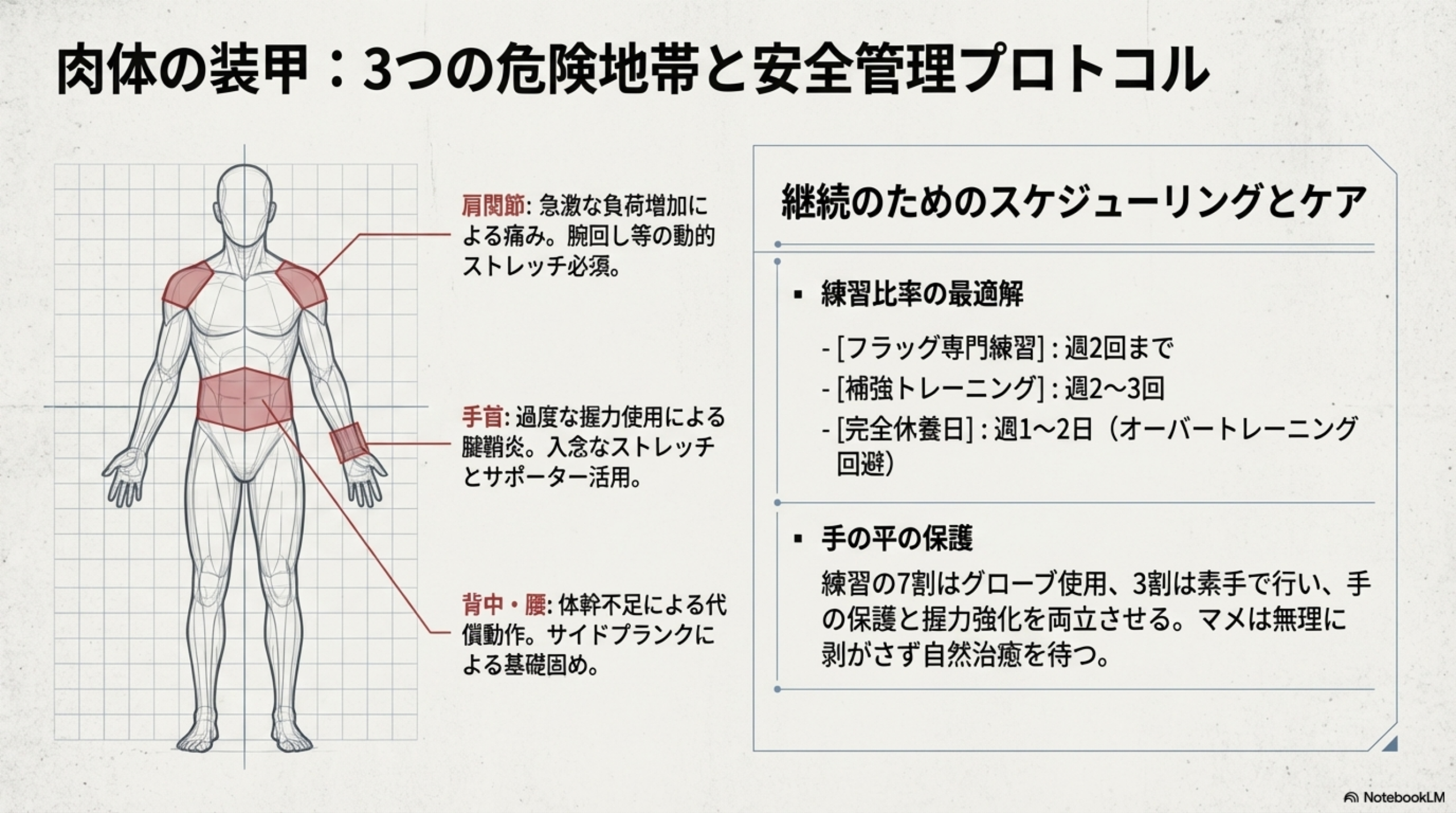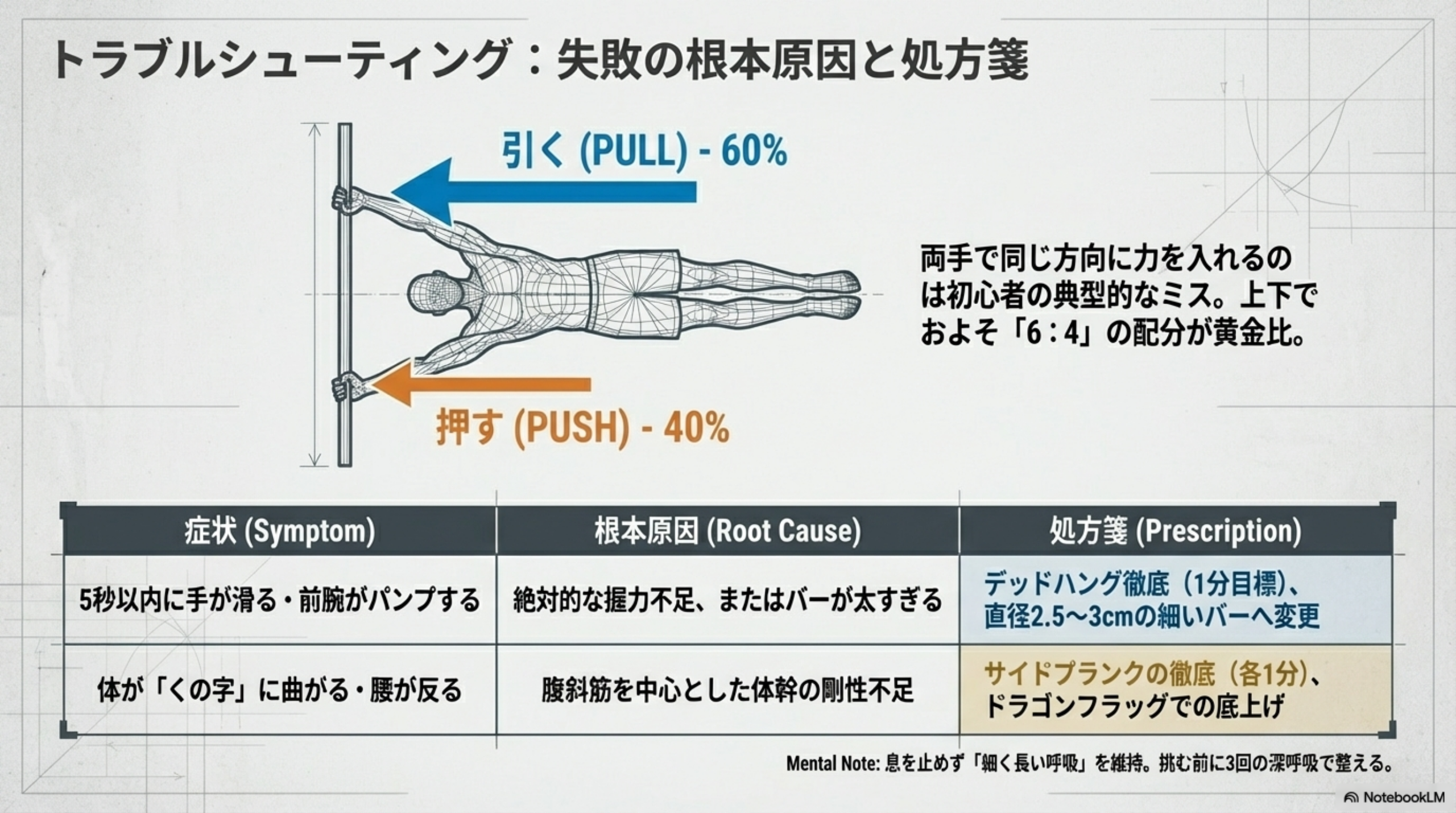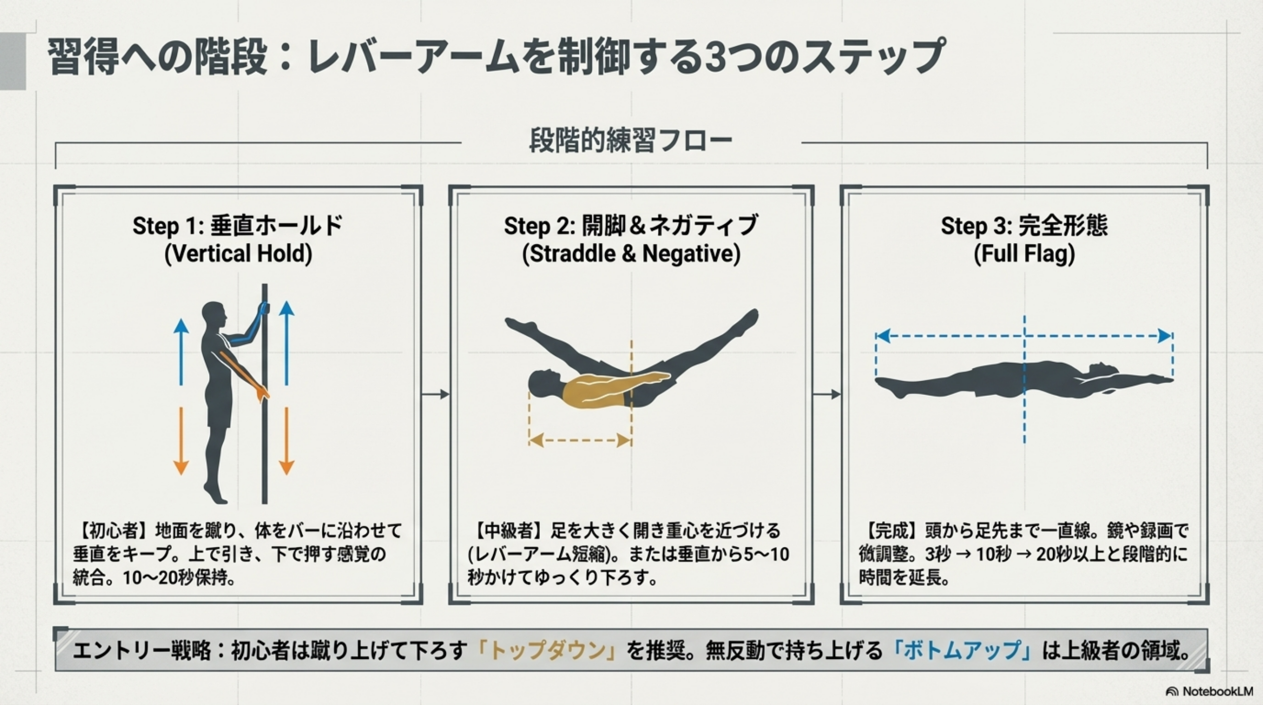 この原理が分かると、「なぜ開脚フラッグから練習するのか」「なぜ膝を曲げた練習が有効なのか」が論理的に理解できます。いずれも重心をグリップポイントに近づけることで負荷を下げているわけです。