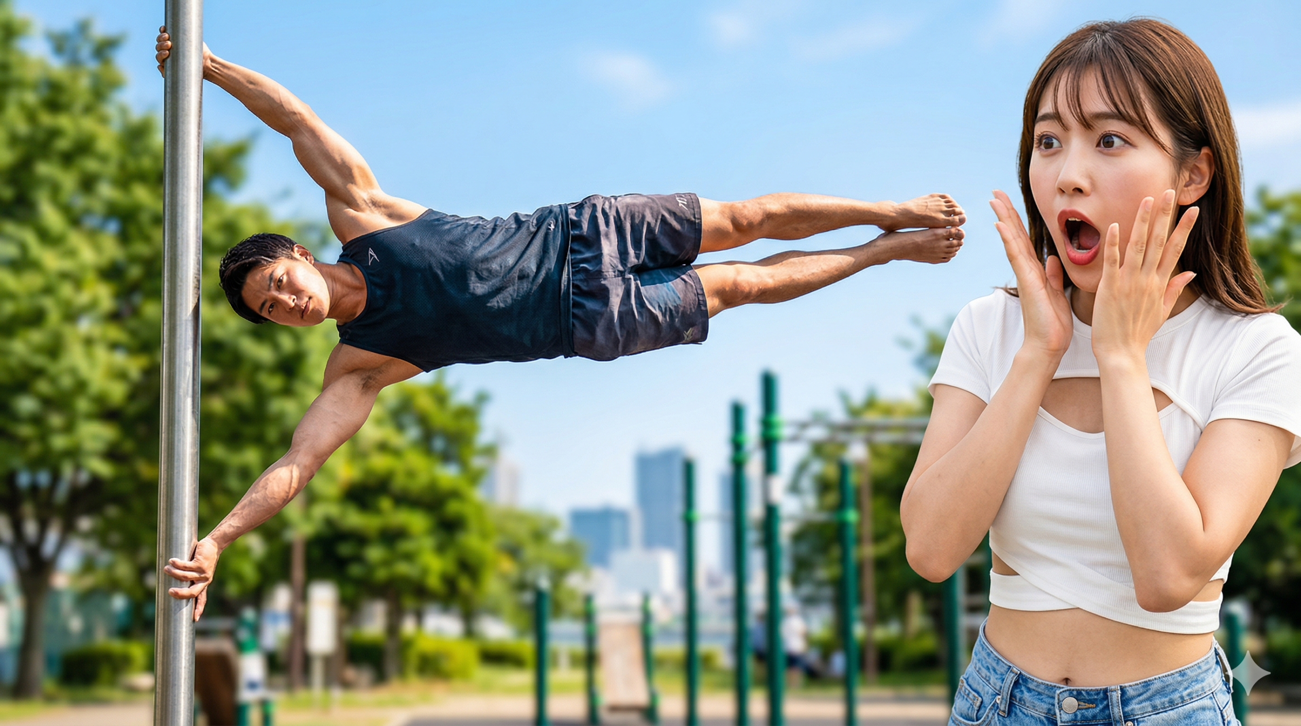 ヒューマンフラッグで培った全身の筋力とボディコントロールは、他のカリステニクス技の習得にも直結します。鉄棒ダンス(バーダンス)の世界にも通じる技術です。