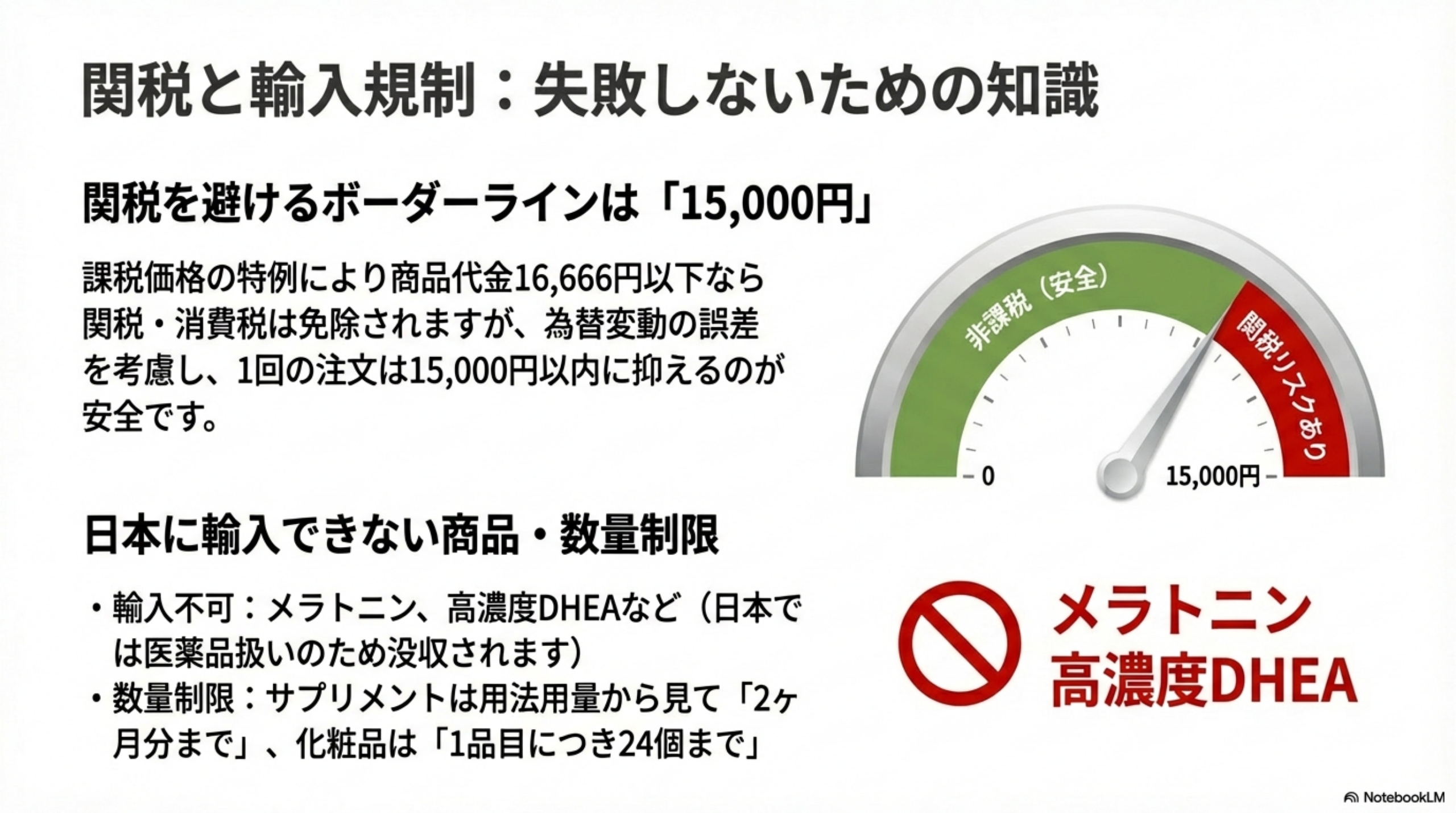 メラトニンなど日本で医薬品扱いの成分は税関で没収される場合があります。サプリメントは2ヶ月分、化粧品は24個までが個人輸入の上限です。