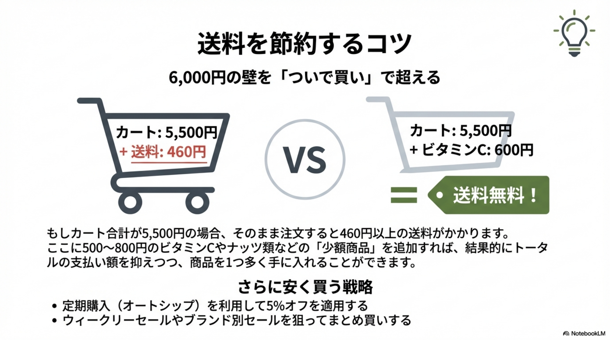 - 5,500円分の商品に500〜800円のビタミンCやナッツ類を追加すれば、送料460円分以上の節約になる