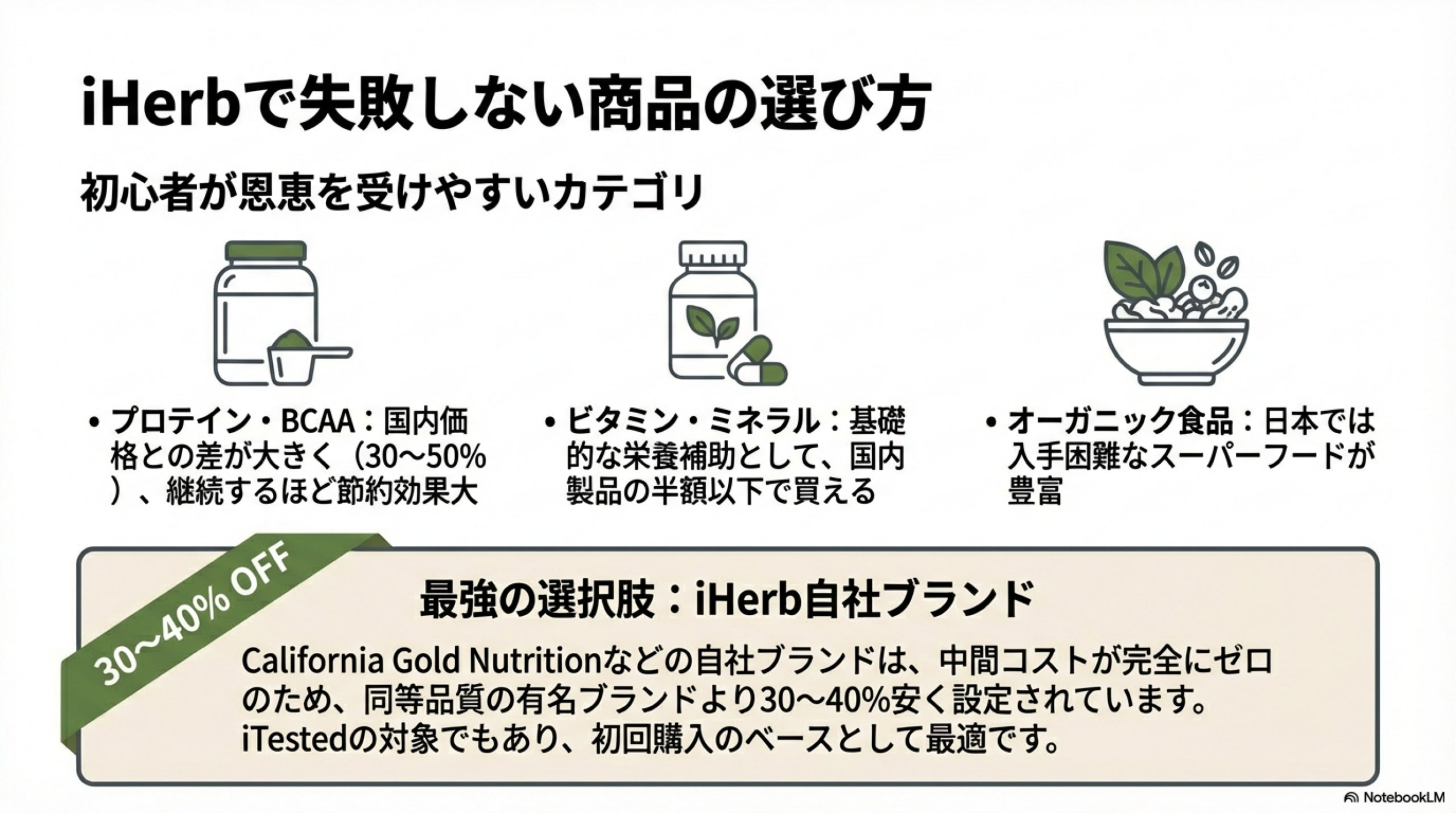 初めてiHerbを利用する場合は、価格差が大きく恩恵を受けやすい商品カテゴリから試すのが合理的です。