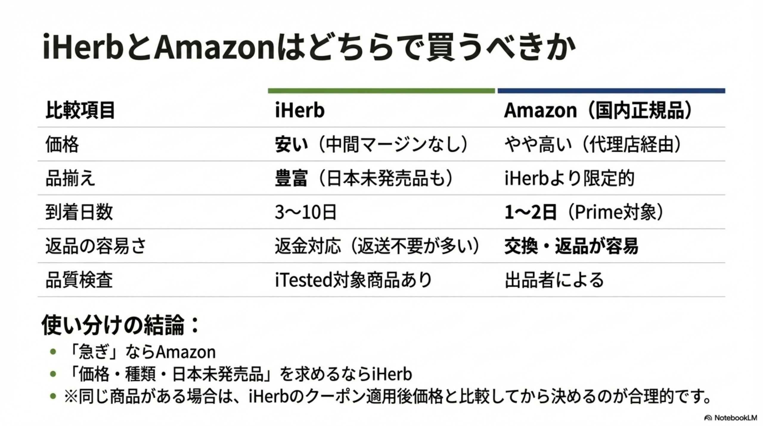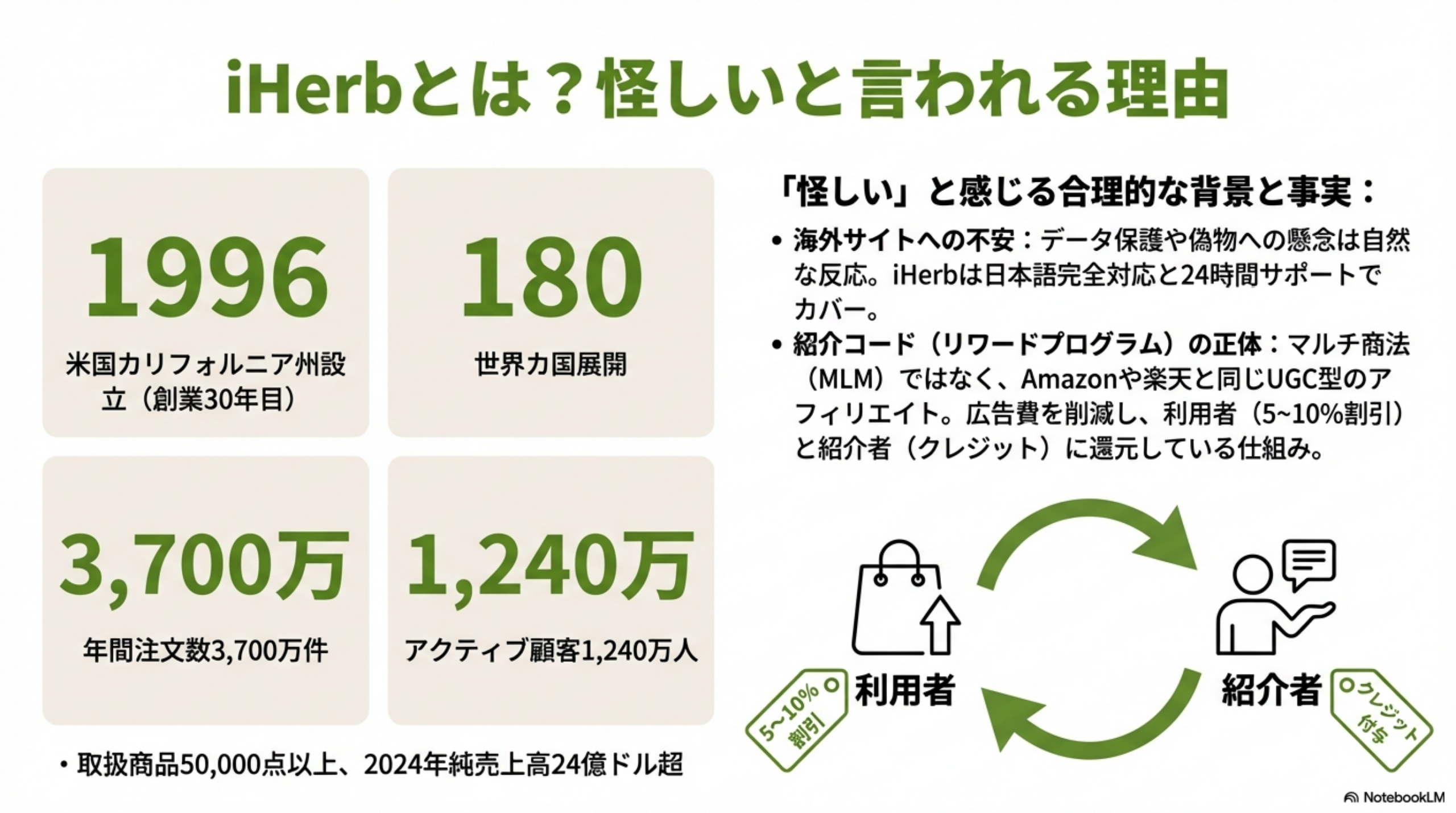 iHerbが怪しく見える理由は、海外サイトへの心理的不安、国内価格との大きな差、紹介コードのMLM的な印象に起因しますが、いずれも合理的に説明できるものです。