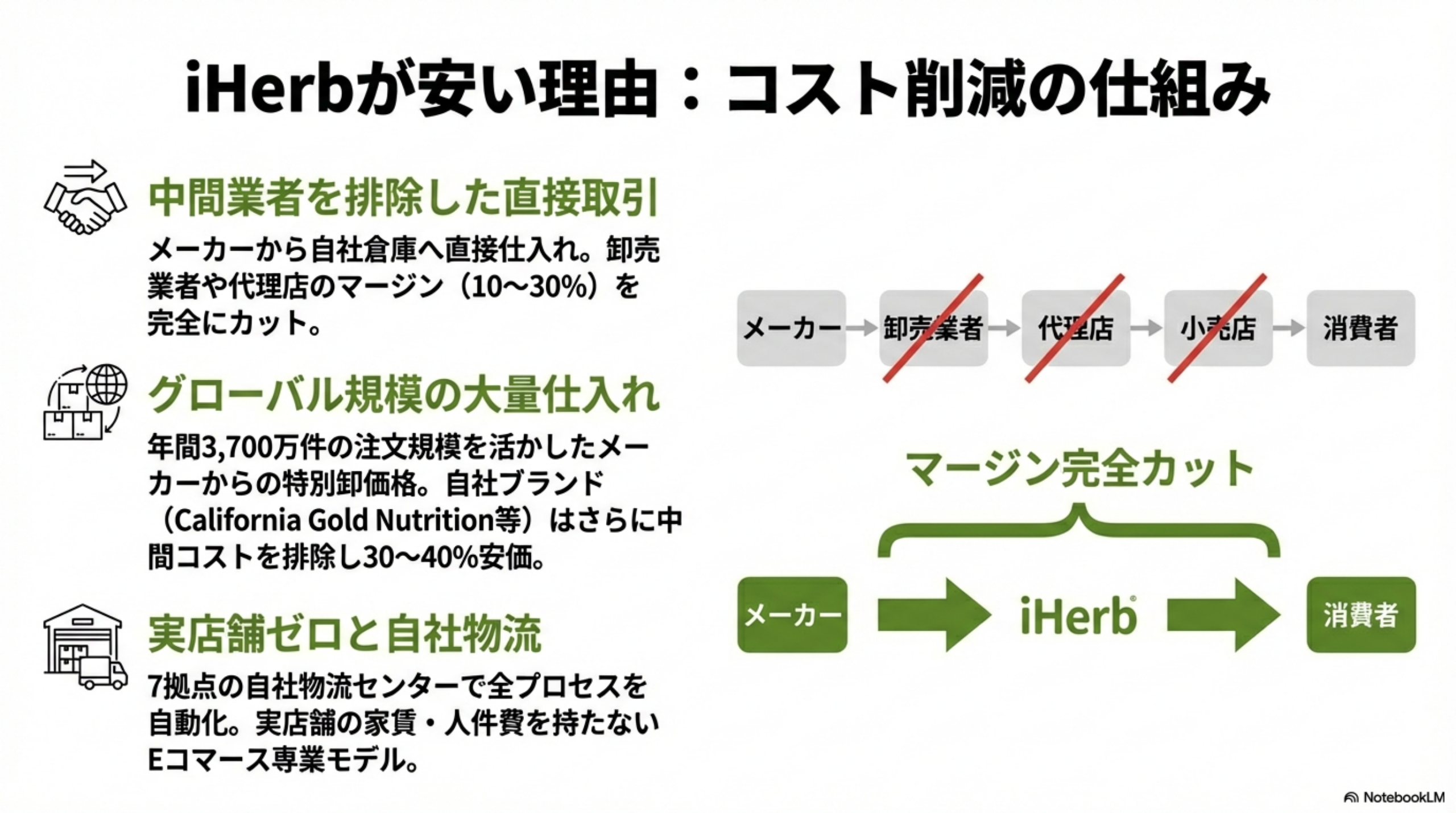 iHerbの商品が国内の通販サイトや実店舗より大幅に安い理由は、品質を下げているからではなく、流通構造の違いにあります。