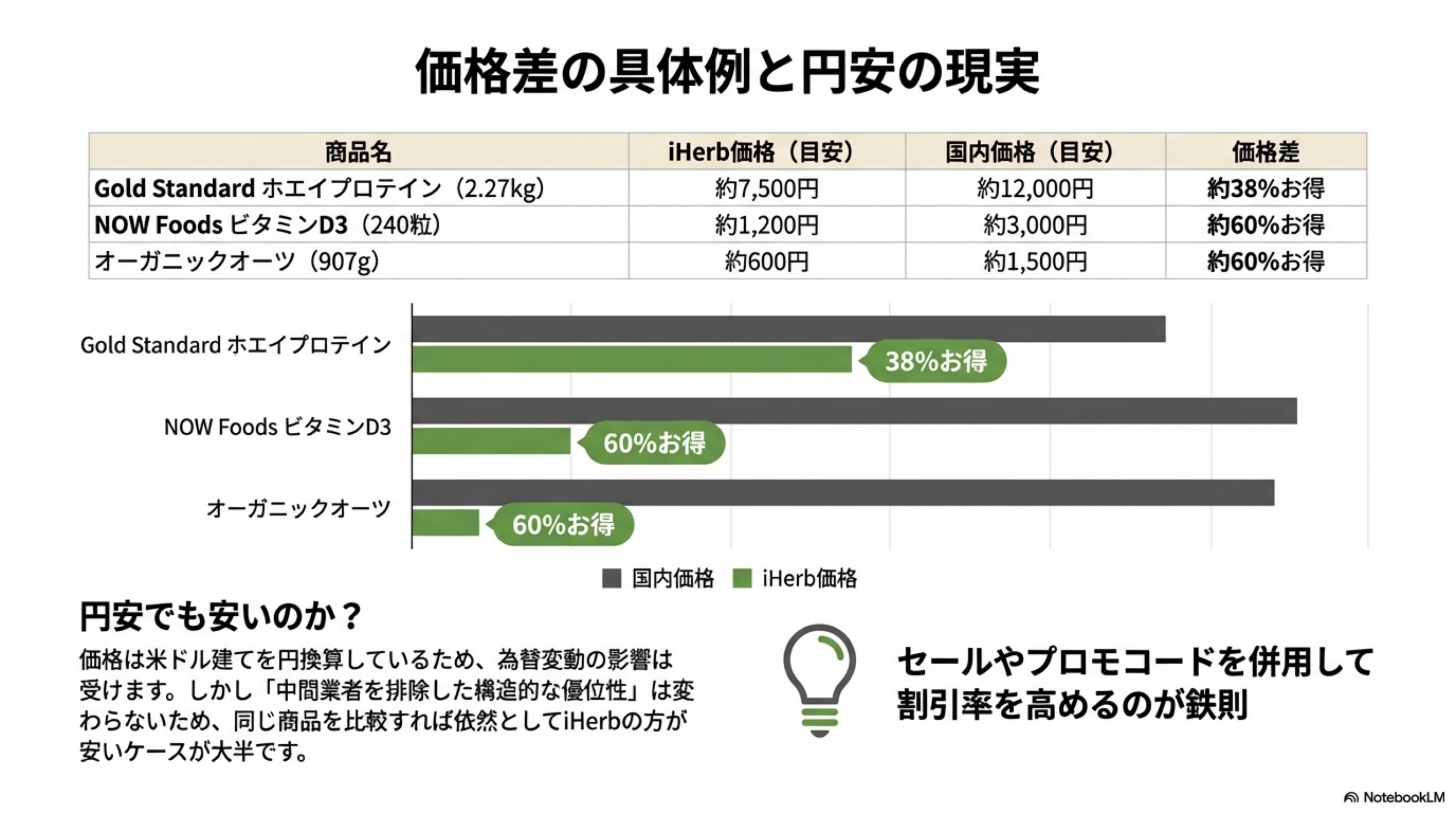 ただし、中間業者を排除した構造的な優位性は為替に左右されません。国内で販売されている商品にも為替の影響は反映されているため、同じ商品を比較すればiHerbの方が安いケースが依然として多いです。