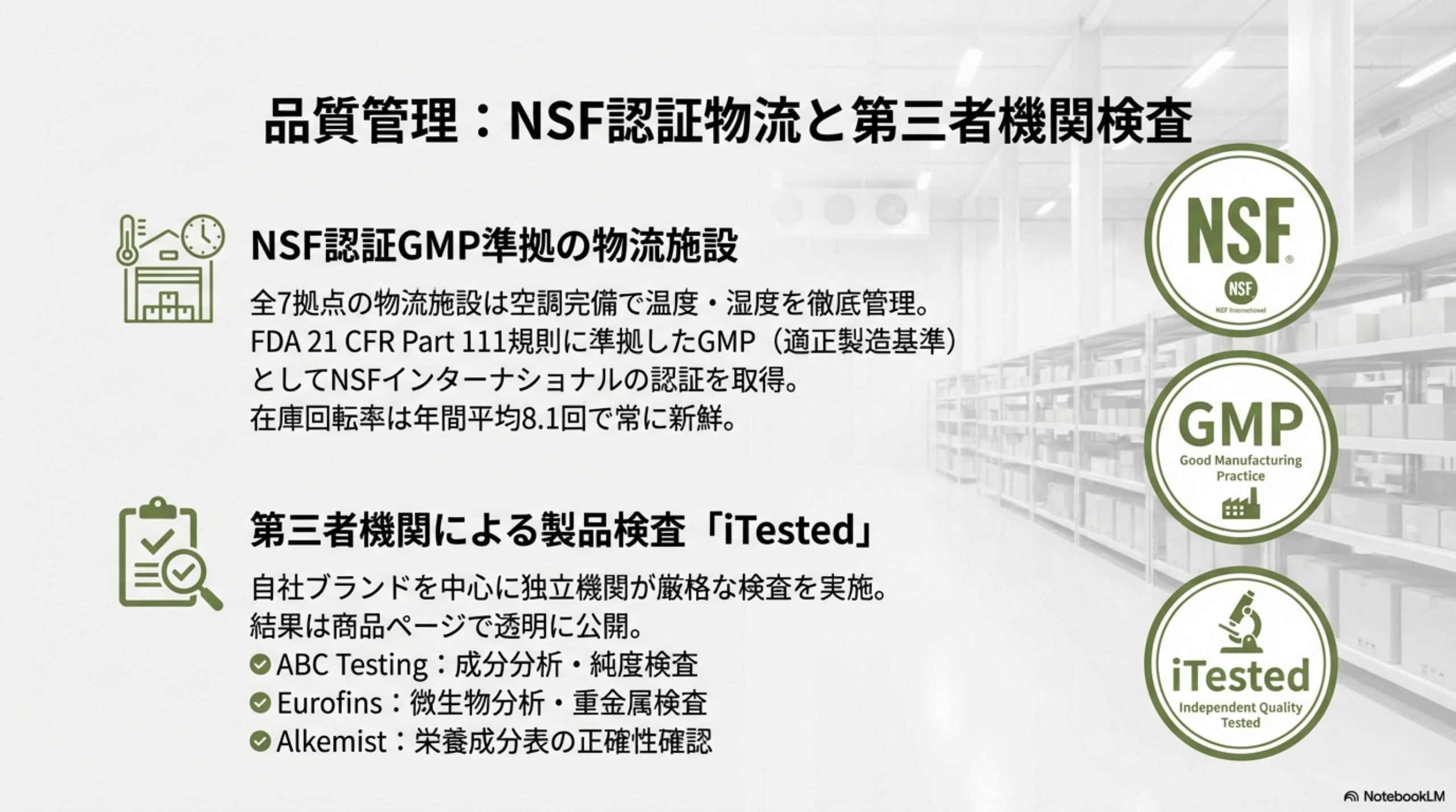 ⚠️ よくある誤解の訂正: 「FDA認定のcGMP」という表現がネット上に多く見られますが、正確にはFDAがiHerbを個別に「認定」しているのではなく、iHerbの物流施設がFDA基準に準拠し、NSFインターナショナルによって認証を受けているという関係です。