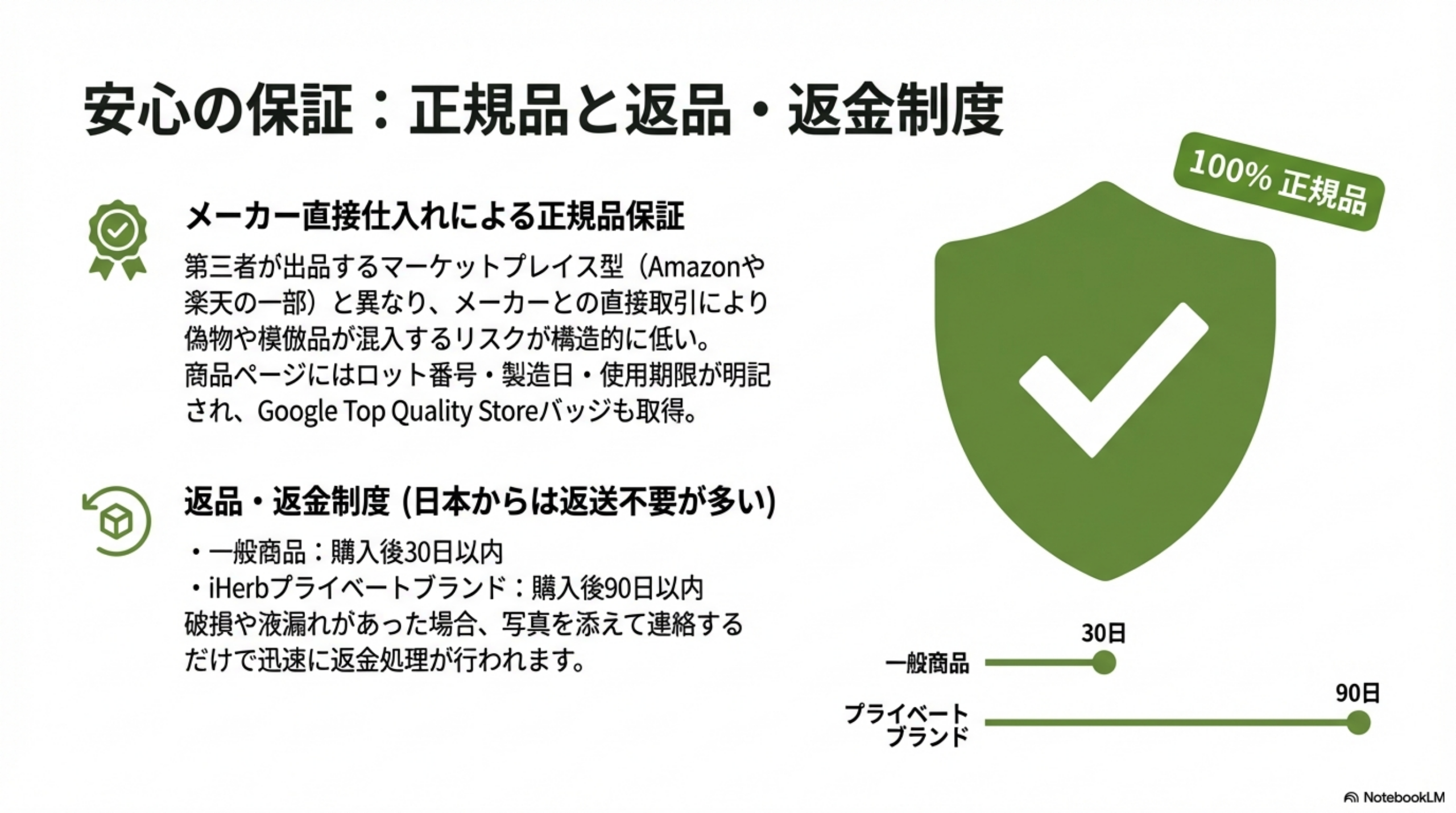 ⚠️ よくある誤解の訂正: ネット上では「iHerbは全商品90日間返金保証」と紹介されていることがありますが、90日間の対象はiHerbプライベートブランド(California Gold Nutritionなど)のみです。一般商品の返品・返金期限は30日間です。