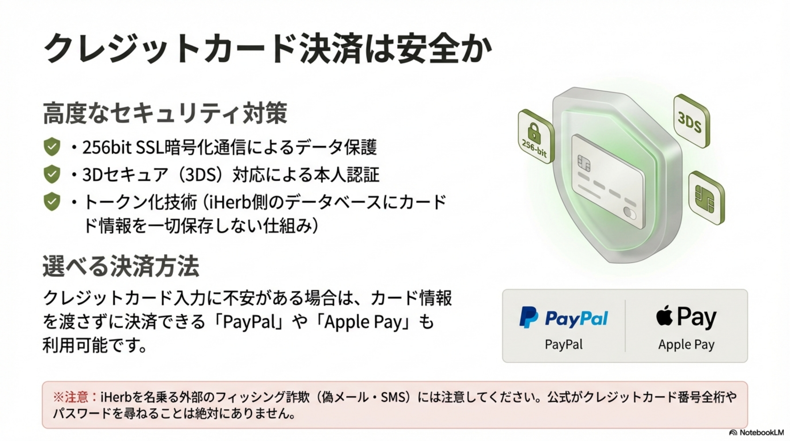 256bit暗号化・3Dセキュア対応で保護されています。カード情報はiHerb側に保存されません。PayPalやApple Payも利用可能です。