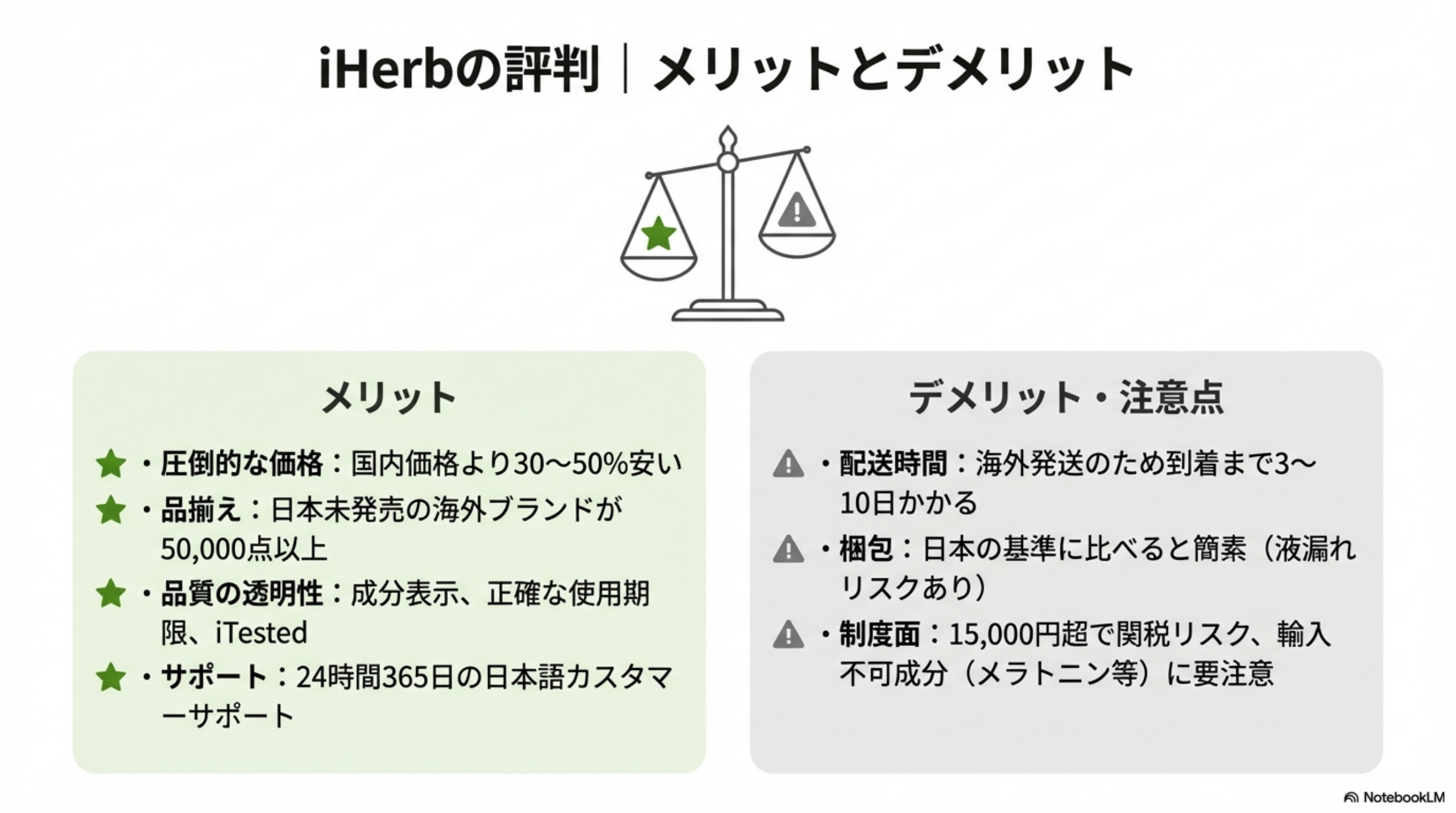 これらの不安は海外通販全般に共通する課題であり、iHerbに限った問題ではありません。重要なのは、これらの懸念に対してiHerbがどのような対策を講じているかです。この記事では、各懸念に対する事実を順番に検証していきます。