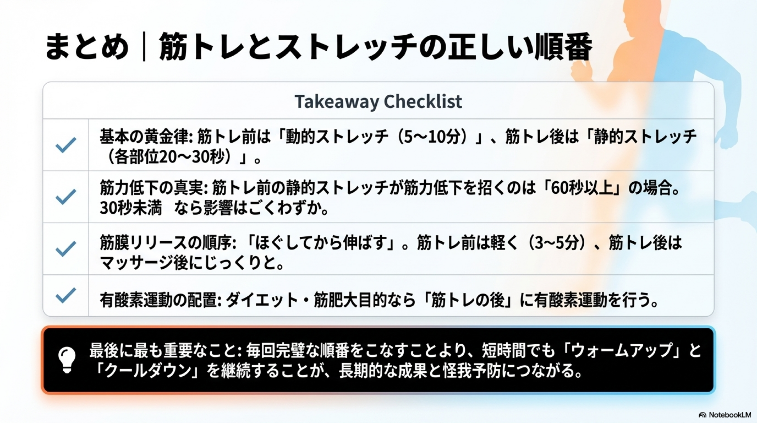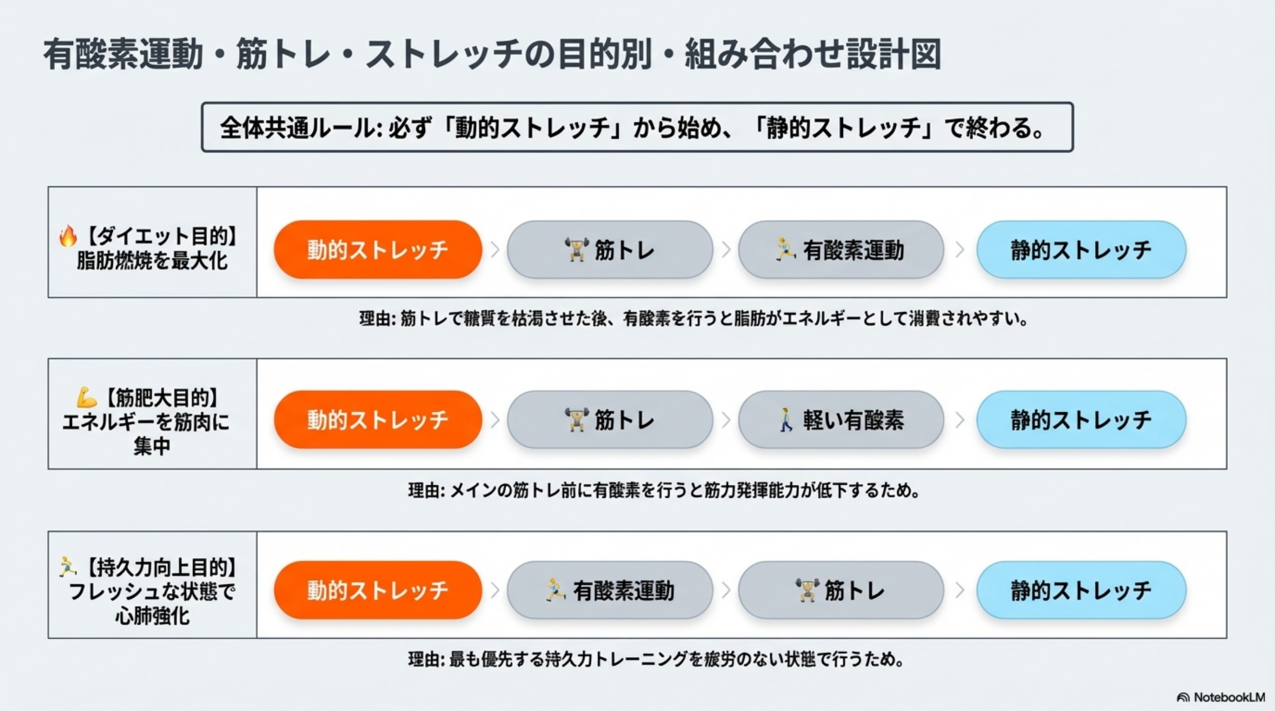 | 筋肥大 | 動的ストレッチ → 筋トレ → 軽い有酸素 → 静的ストレッチ | 筋トレに全エネルギーを集中させるため、有酸素運動は筋トレ前に行わない |