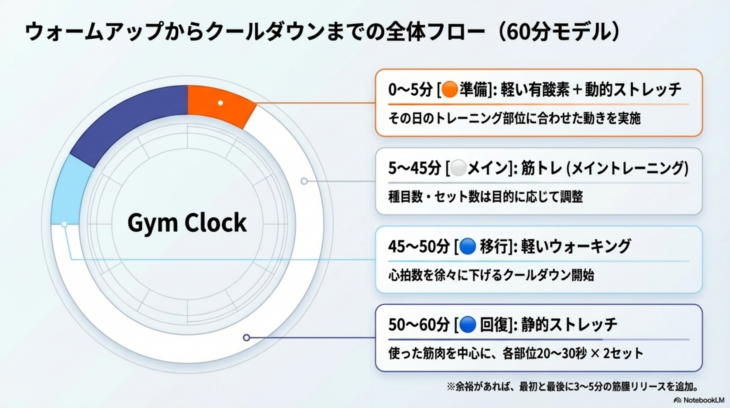 「全部やると時間が足りない」という方のために、60分のジムセッションでの具体的な時間配分例を紹介します。