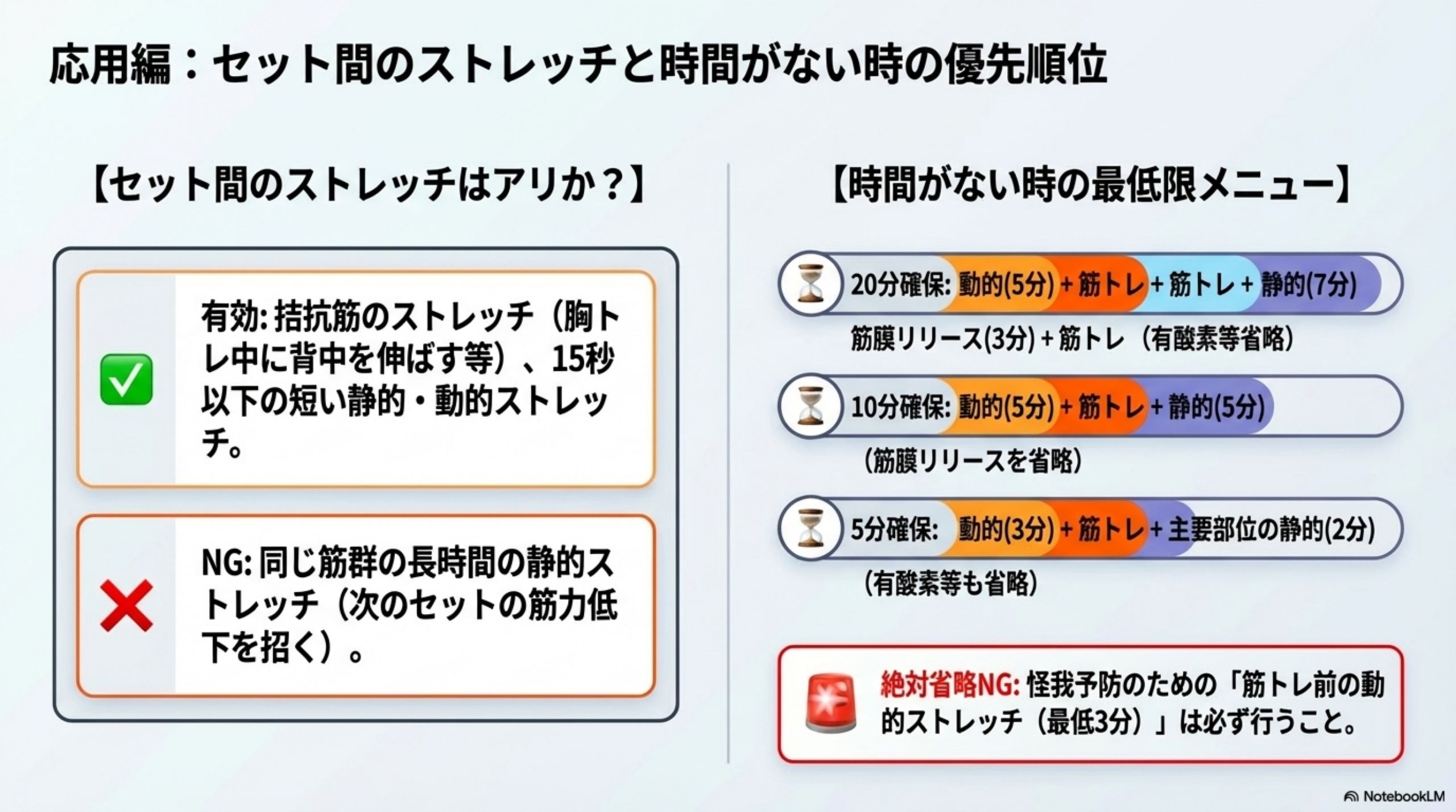 | 5分のみ | 鍛える部位の動的ストレッチ3分 + 筋トレ後の主要部位ストレッチ2分 | 筋膜リリース・有酸素運動 |